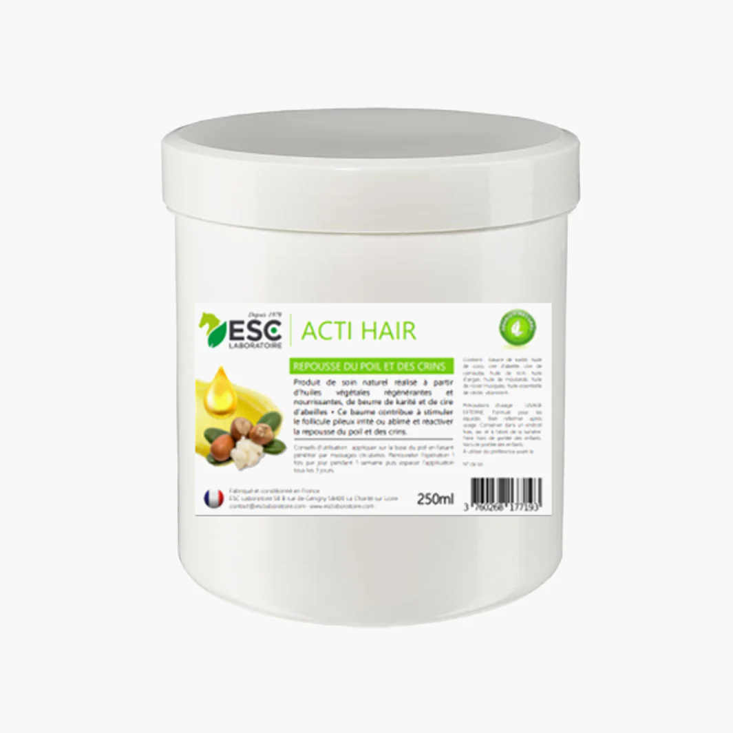ACTI HAIR | ESC est une crème 100% naturelle conçue pour accompagner les zones irritées, démangées ou frottées qui peuvent être à l’origine d’une perte de poils ou de crins, souvent disgracieuse et épuisante pour l’épiderme. Plus qu’un simple soin, c’est une solution ciblée qui nourrit le follicule pileux et réactive la repousse, tout en fortifiant et protégeant la peau qui entoure les poils.