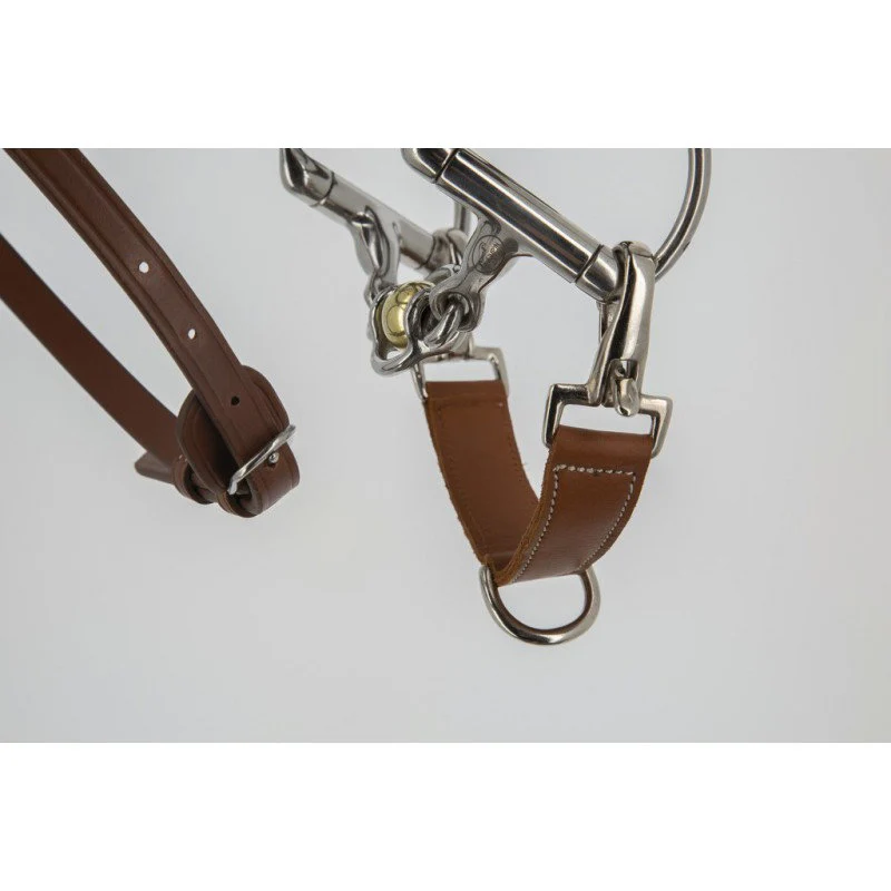Alliance de mors multi-usage : Peut être utiliser en longe pour changer de main facilement avec son système d’attache central mais aussi en main pour marcher ou présenter un cheval. Dans les deux cas, l’alliance s’attache de chaque côté du mors grâce à deux petits mousquetons en acier inoxydable. Le reste de cette pièce très utile au quotidien pour le couple cavalier-cheval est constitué d’un joli cuir cognac.