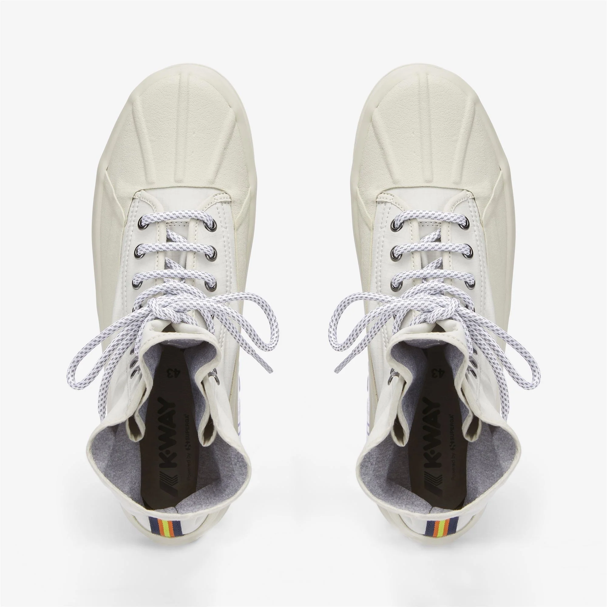 La sneaker Alpina de Superega a marqué l’histoire de la mode avec l’empreinte audacieuse de sa semelle intermédiaire emblématique. Le modèle est né dans les années 1950 et a immédiatement connu un grand succès auprès des amoureux de montagne. Révisée pour K-Way dans la version avec une tige en polyester imperméable et respirante liée au jersey; design montant qui épouse la cheville et soutient le mouvement.