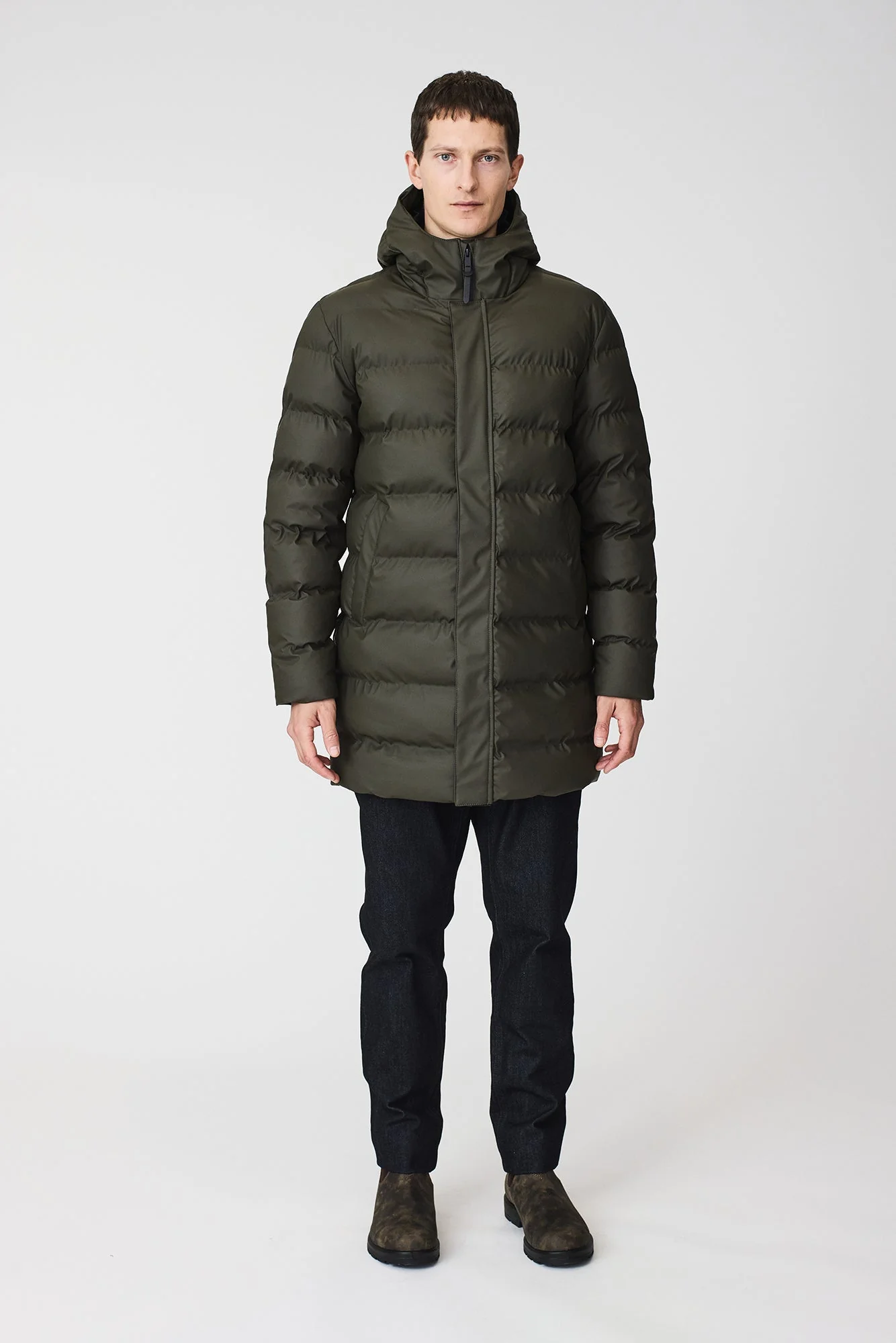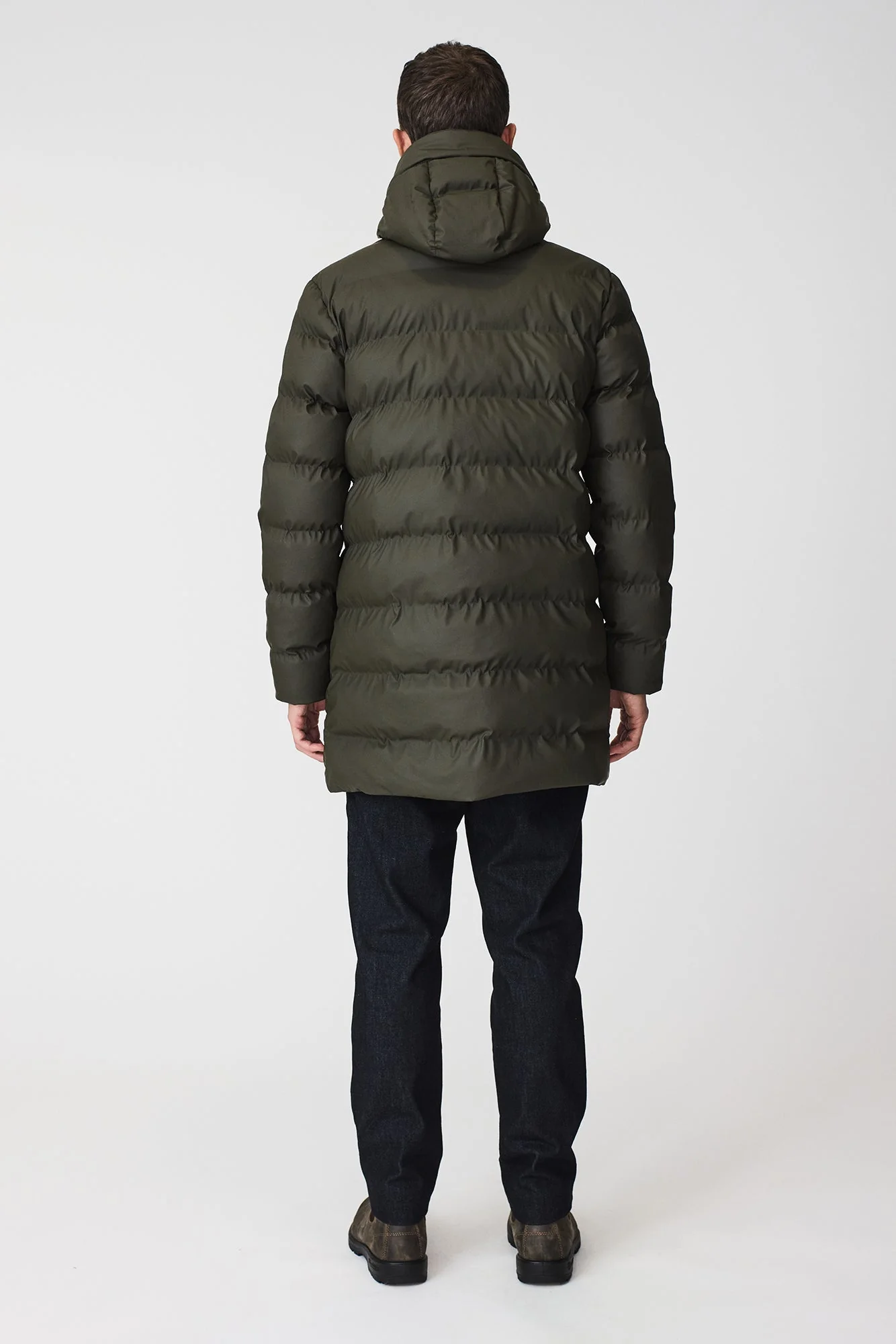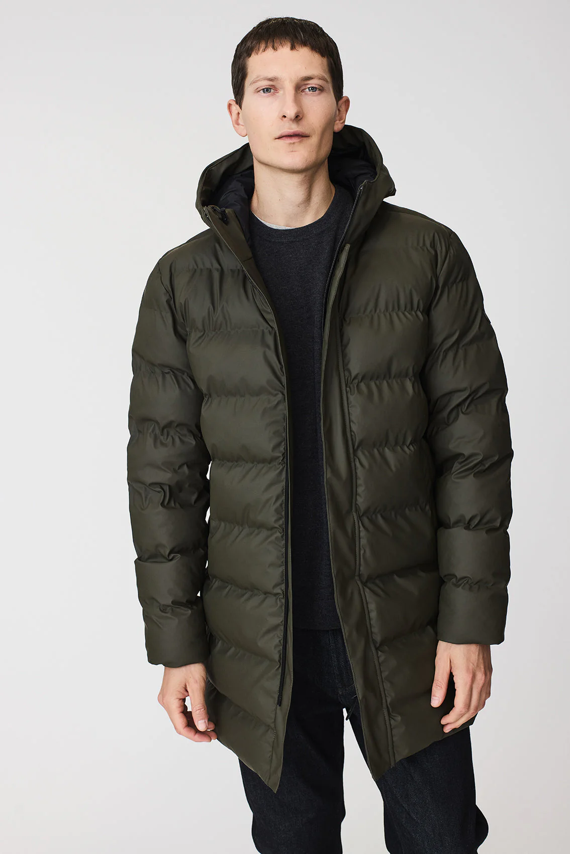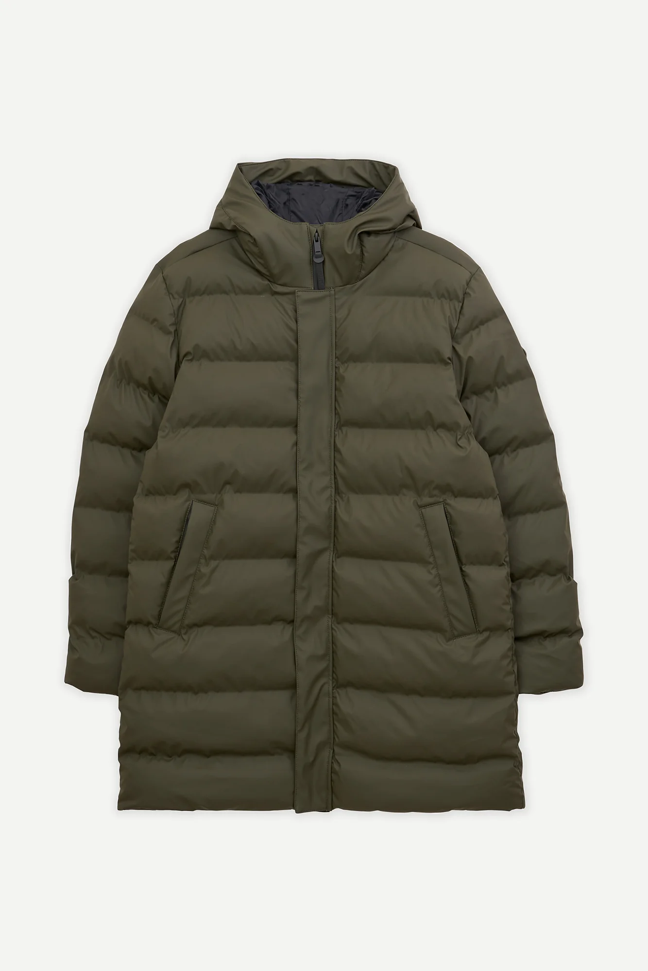 Entre sus detalles destacan una cremallera impermeable de doble cursor con cierres magnéticos ocultos en la tapeta frontal, además de correas interiores tipo mochila que permiten llevarlo cómodamente sin usar las manos. Un abrigo acolchado de diseño depurado, perfecto para los días más fríos y lluviosos.