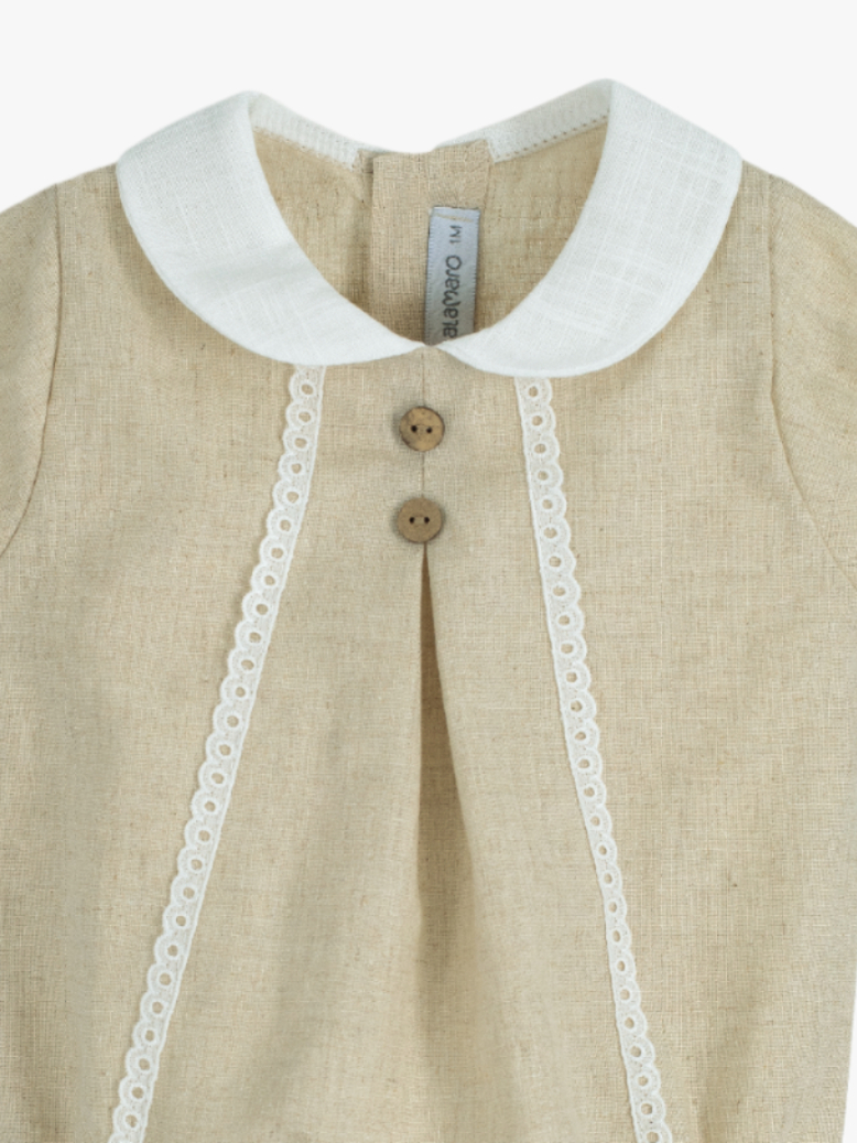 Commandez dès maintenant cette barboteuse bébé mixte à col rond en coton et lin dans notre boutique en ligne et offrez à bébé un vêtement conçu avec soin, parfait pour accompagner ses premiers mois avec élégance.