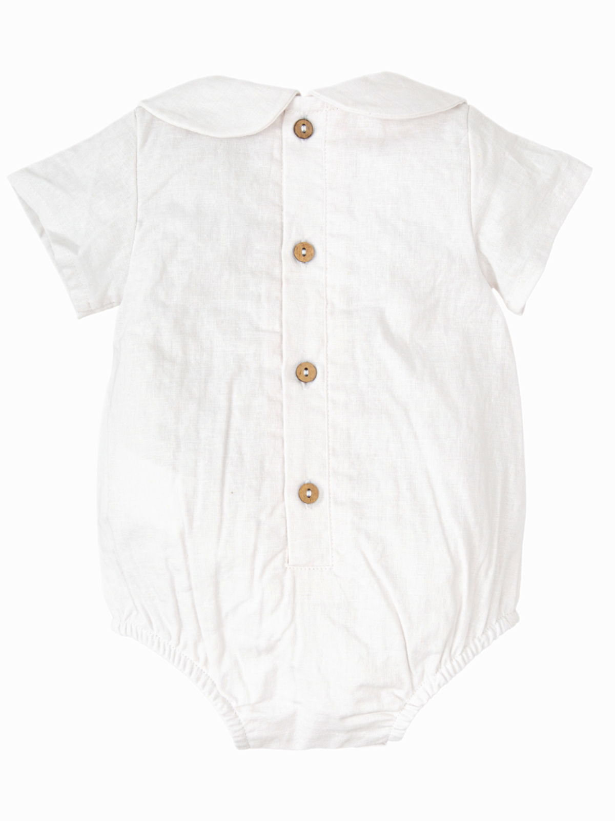Confectionnée en coton de qualité, cette barboteuse est équipée de manches courtes, parfaites pour les événements printaniers ou estivaux. Son design classique est sublimé par trois boutons décoratifs placés sur le devant, apportant une touche de sophistication discrète. Les plis plats raffinés sur le devant ajoutent une dimension élégante et apportent de la texture à ce modèle déjà sublime.