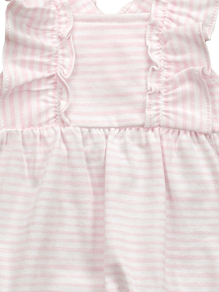 Les rayures rose et blanche apportent une touche de fraîcheur et d’innocence, tandis que les bretelles délicates et les fronces élégantes sur le devant ajoutent une finition féminine et raffinée. Chaque détail a été pensé pour créer une tenue à la fois pratique et sophistiquée, parfaite pour les petits moments du quotidien.