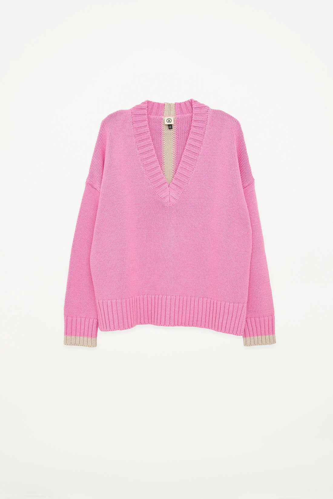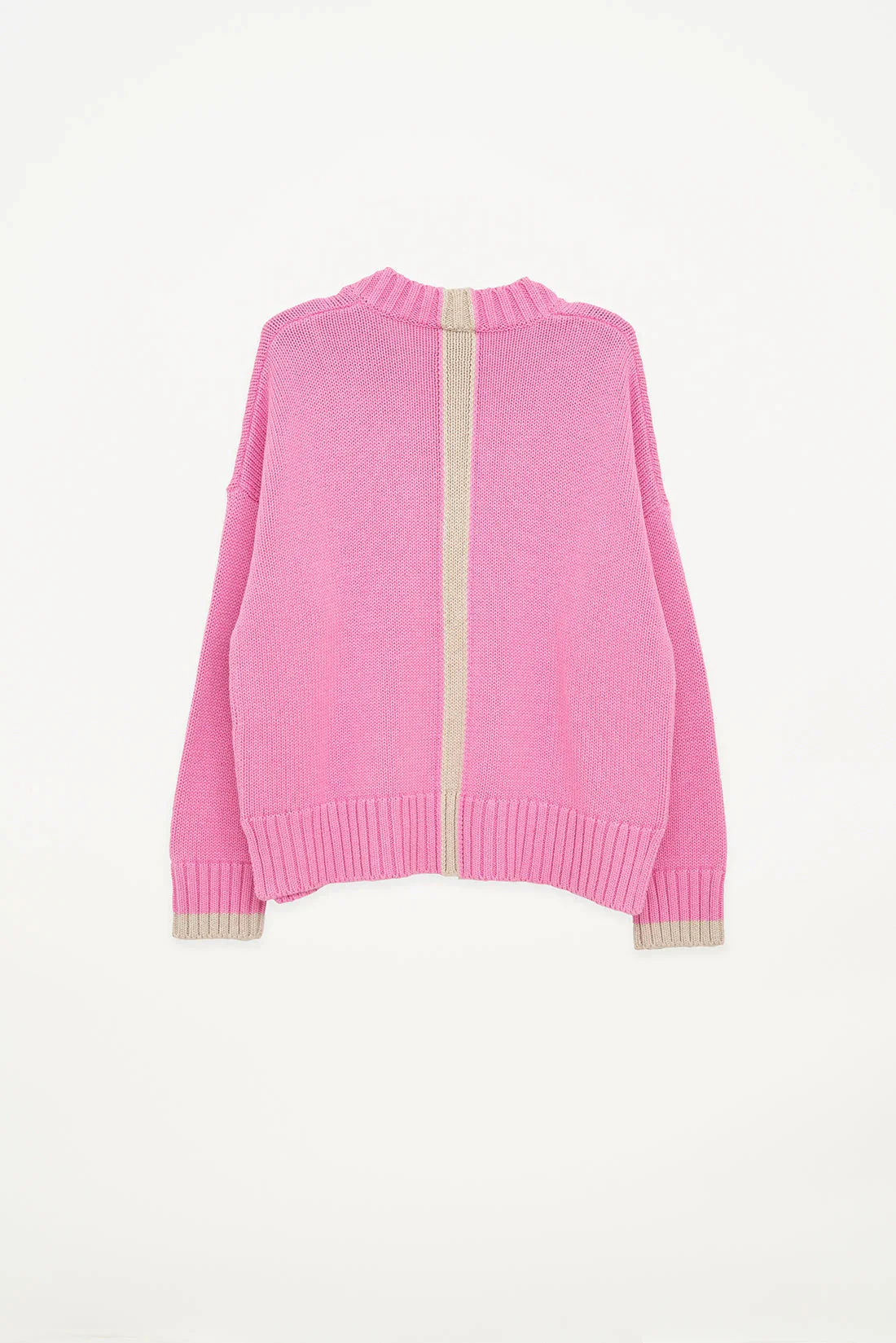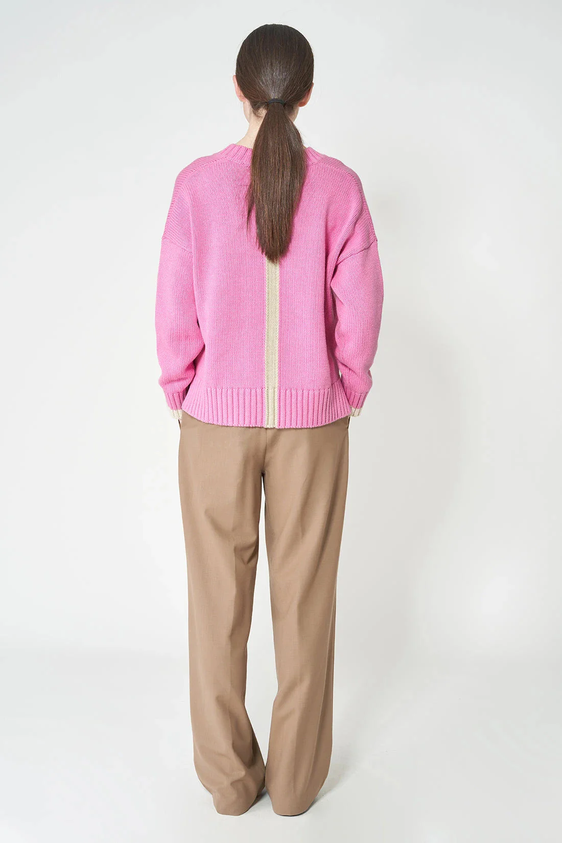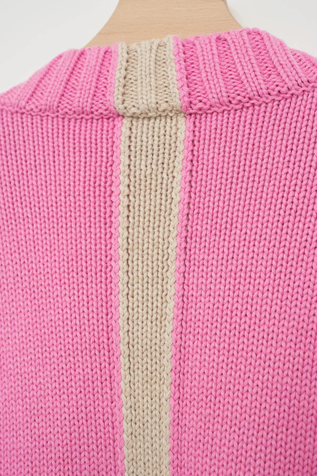 El jersey Berf está tejido con una suave lana vegana en diferentes tonos, creando una raya vertical a contraste en la espalda y el borde de los puños. Tiene una silueta relajada, escote pico y aberturas laterales en el bajo para acentuar el corte.