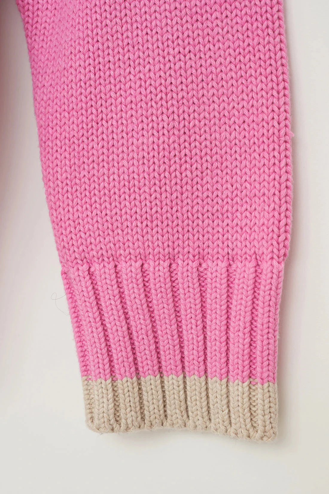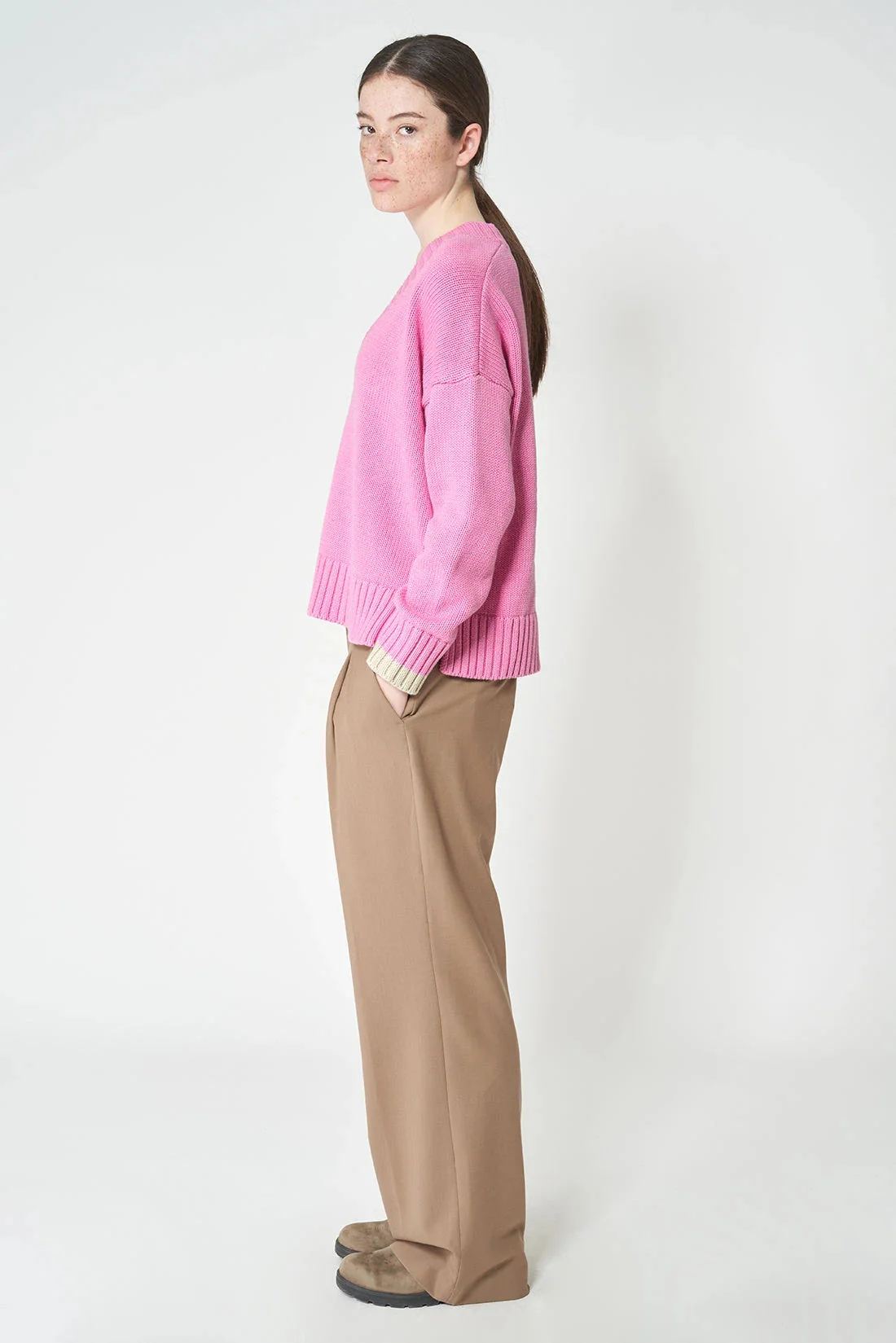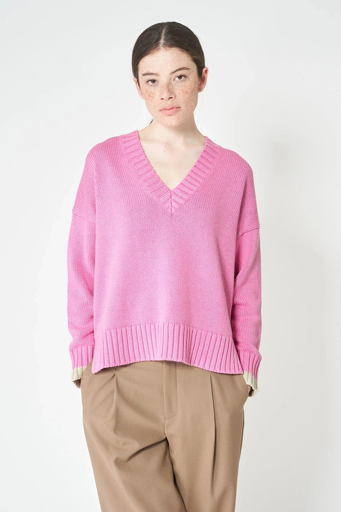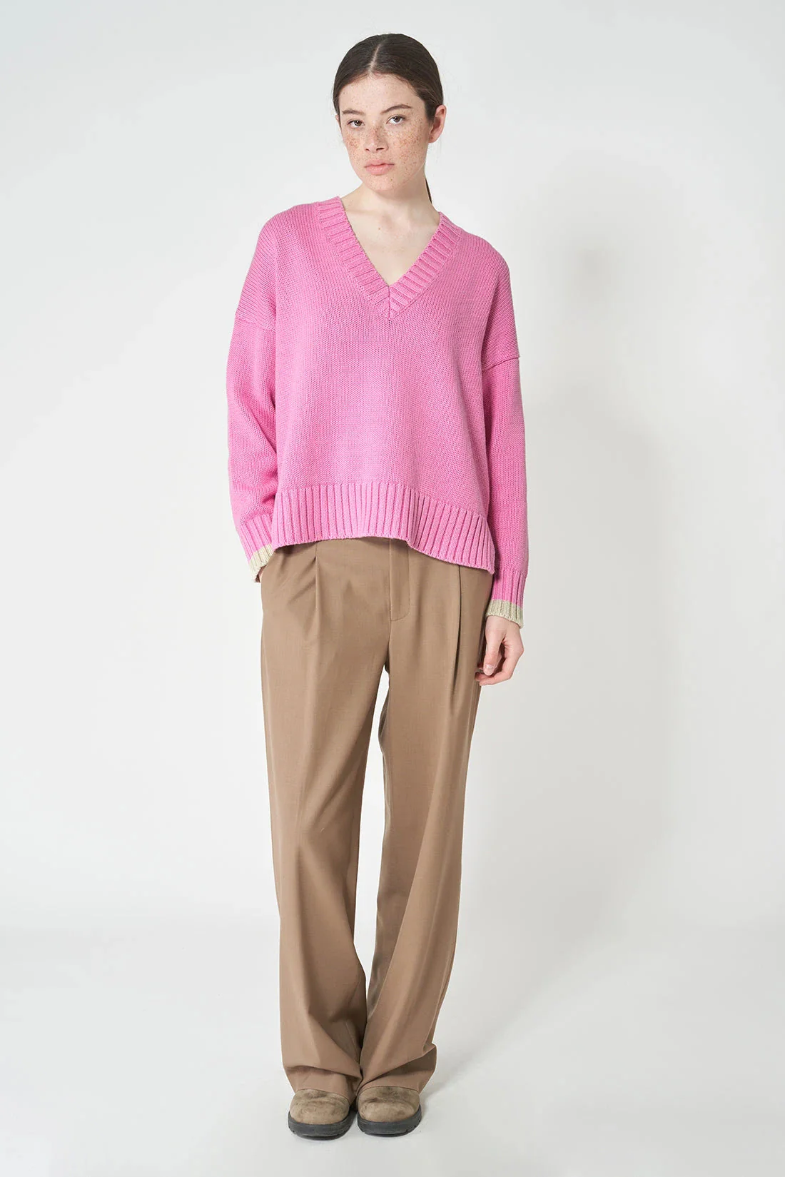 El jersey Berf está tejido con una suave lana vegana en diferentes tonos, creando una raya vertical a contraste en la espalda y el borde de los puños. Tiene una silueta relajada, escote pico y aberturas laterales en el bajo para acentuar el corte.