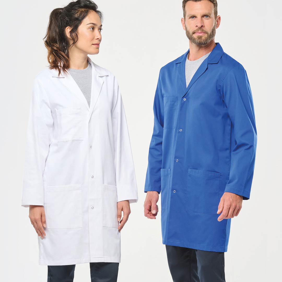 100% coton. Tissu sergé. Lavable à 60°C. Col ouvert. Fermeture devant par 4 boutons pression. 2 poches plaquées ouverte devant + 1 poche poitrine ouverte côté droit. Boucle d’accrochage intérieur col. Certifié STANDARD 100 by OEKO-TEX®N° CQ1007/8, IFTH.