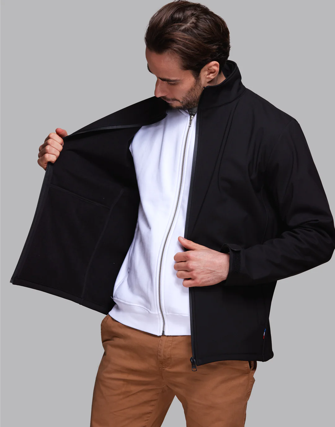 Veste softshell Homme Made in France en polyester recyclé. Confectionné dans l’Oise, ce blouson est composé à 38% de polyester recyclé. Composition globale : 94% Polyester 6% Elasthanne. Softshell imperméable et respirante 3 couches avec membrane en TPU.