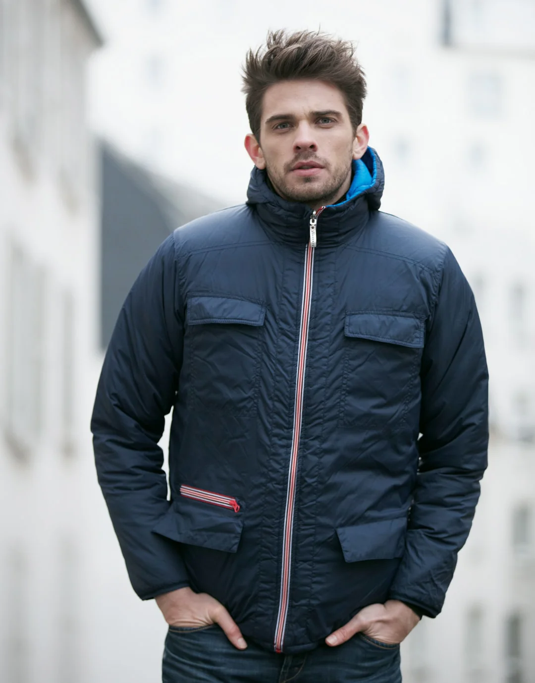Blouson unisexe réversible. La première face est constituée de poches passepoilées, le zip joue sur les contrastes grâce à sa couleur différente.