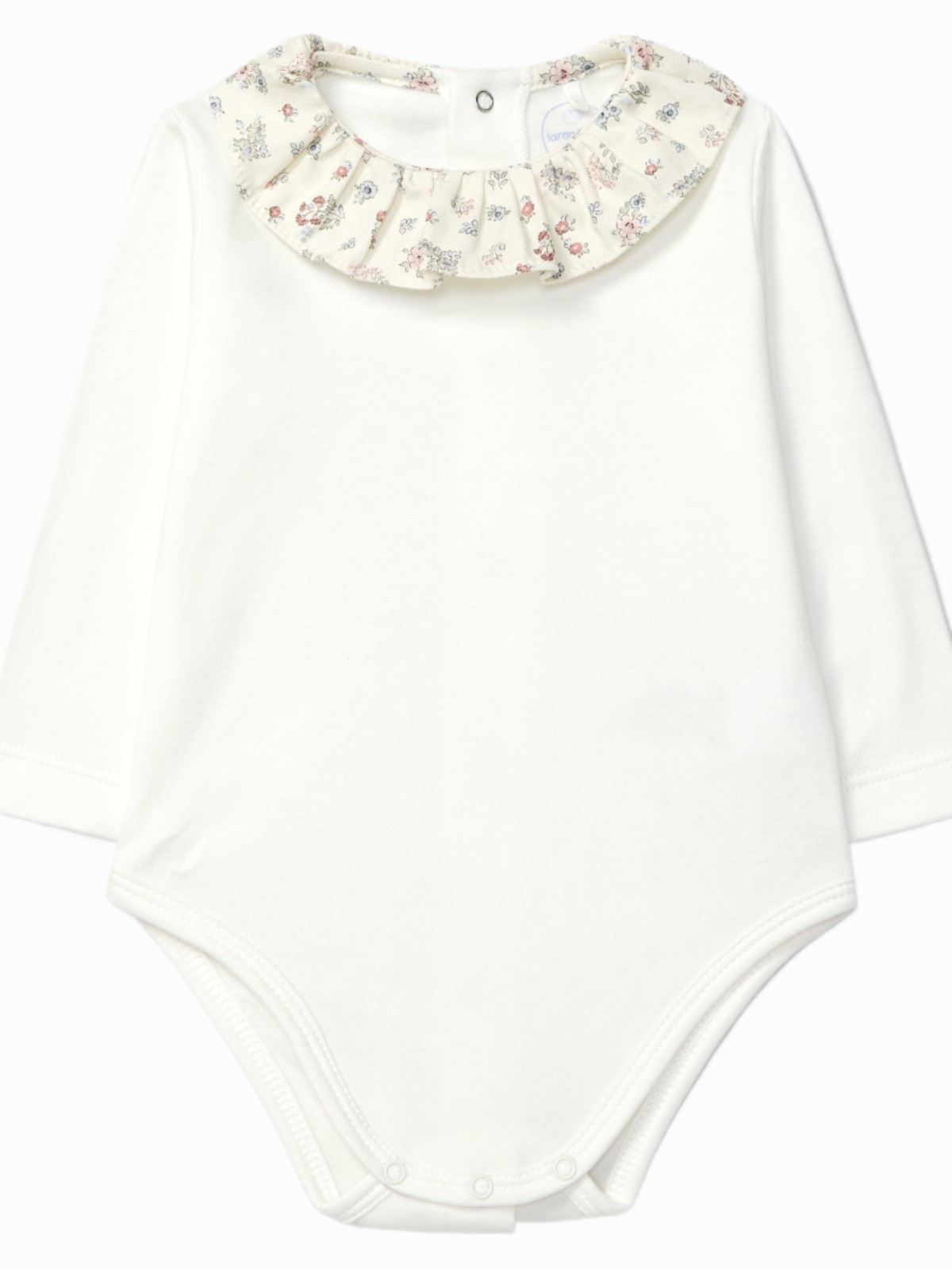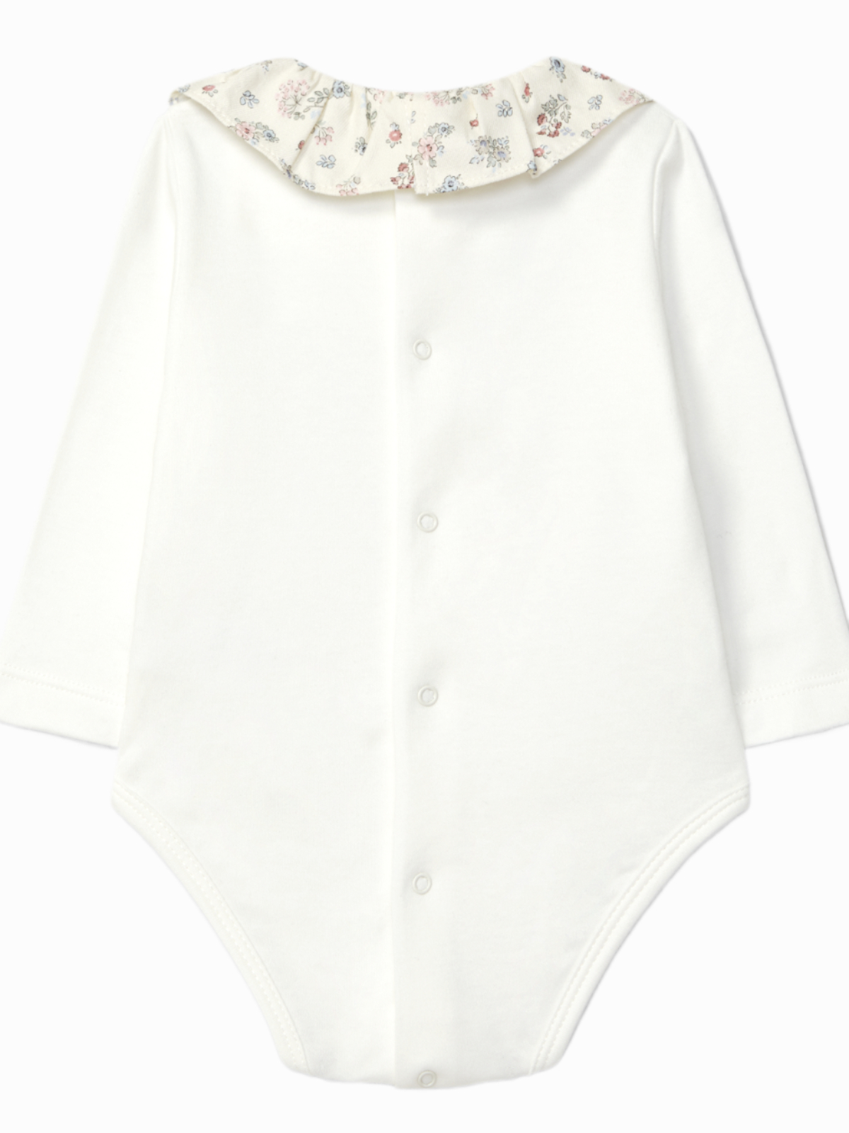 Manches longues Col volanté à motifs floraux Fermé par une patte de boutons-pression au dos Boutons-pression à l’entrejambe 100% coton Fabriqué au Portugal Ce body taille normalement. Choisissez la taille habituelle.
