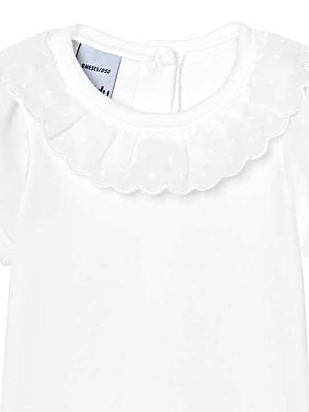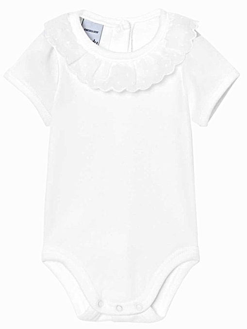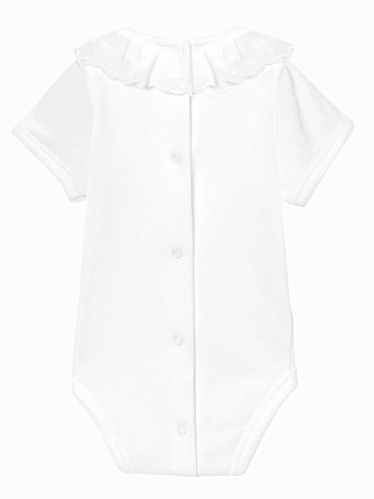 Collerette fine et raffinée à pois Fermé par des boutons-pression dans le dos Boutons-pression à l’entrejambe 100% coton Fabriqué en Espagne Ce body taille normalement. Choisissez la taille habituelle.