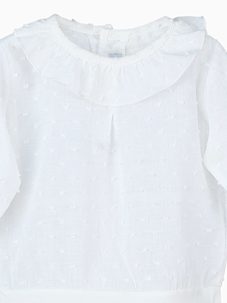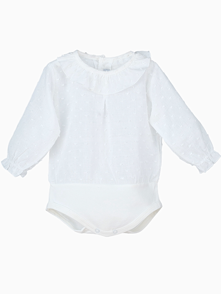 Le design ingénieux de ce body en coton texturé Plumetis donne l’illusion d’une blouse sophistiquée grâce à sa collerette délicate, qui apporte une note de raffinement intemporel à la tenue de votre petite princesse. Confectionné dans un coton fin et léger, ce body assure un confort optimal tout au long de la journée, même pour les peaux les plus sensibles.
