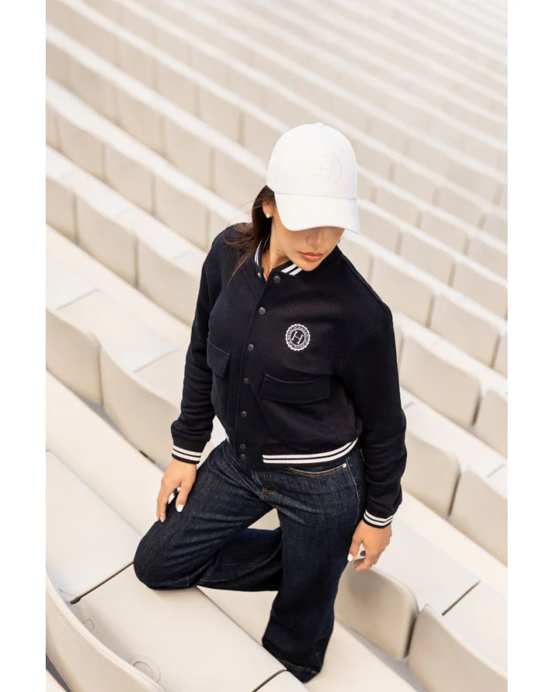 Bomber Coupe classique, bomber court Fermeture du bomber par des boutons à pressions ton sur ton Deux poches à rabat sur le devant Finition du bomber, des poignets et du col ressérée Détail de deux lignes blanches sur le col, les poignets et le bas du bomber Logo Harcour brodé contrasté sur le côté gauche […]