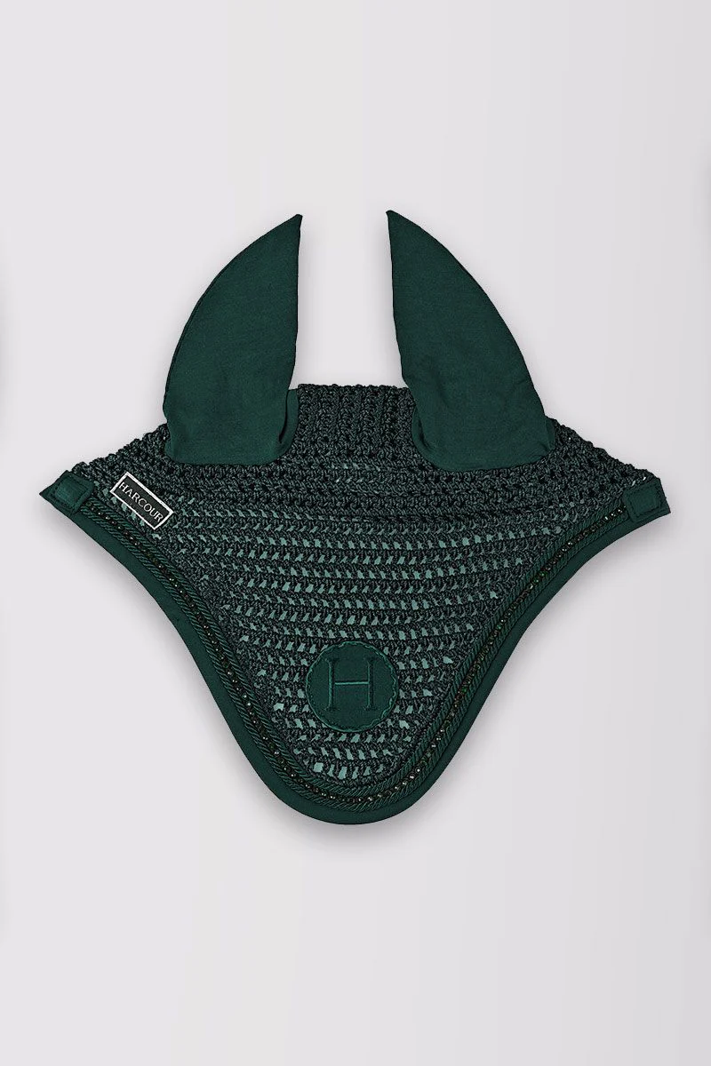Bonnet de cheval Mailles tricotées à la main Oreilles en coton pour s’adapter à toutes les morphologies Deux cordelettes ton sur ton et une ligne de strass résistant à l’eau Logo Harcour sur le devant Peut être assorti au tapis de selle SAPHIR