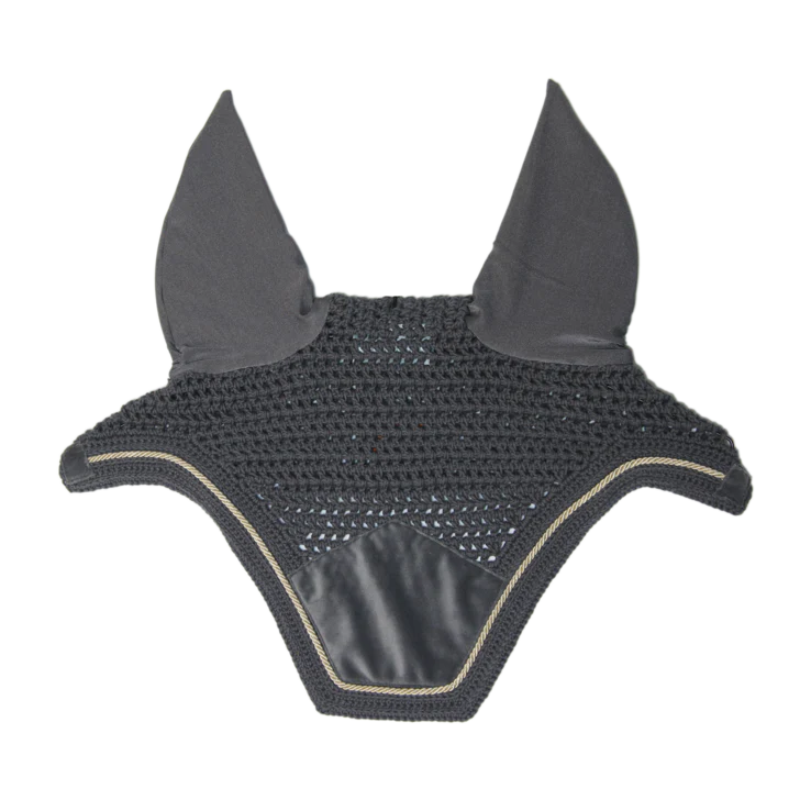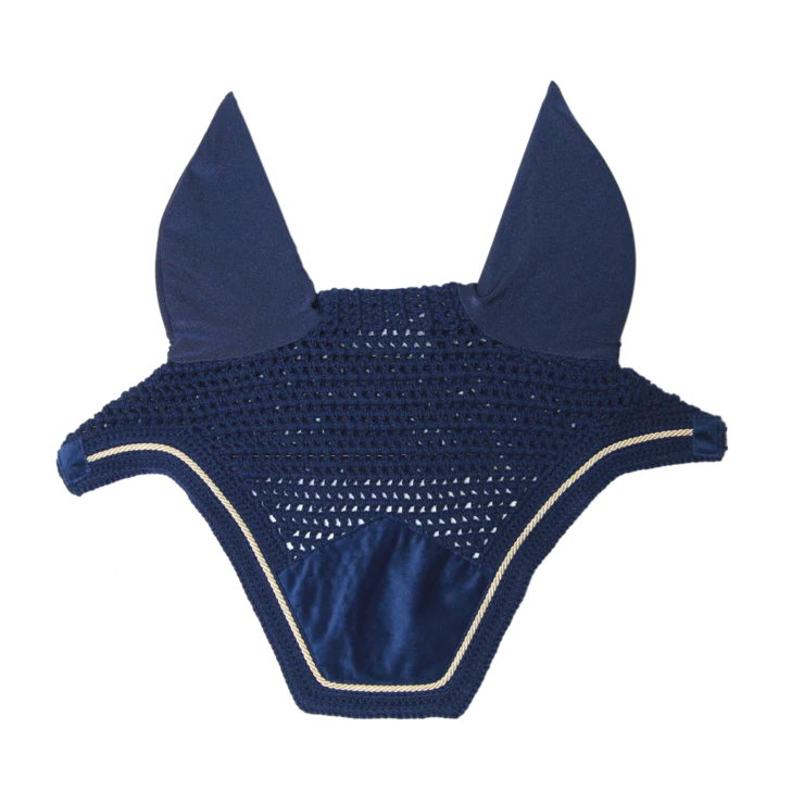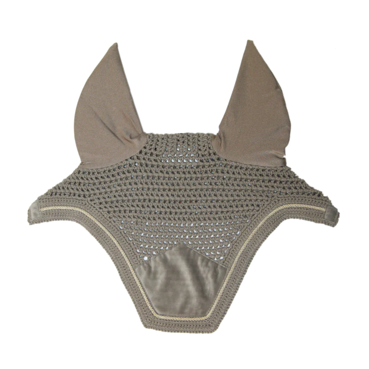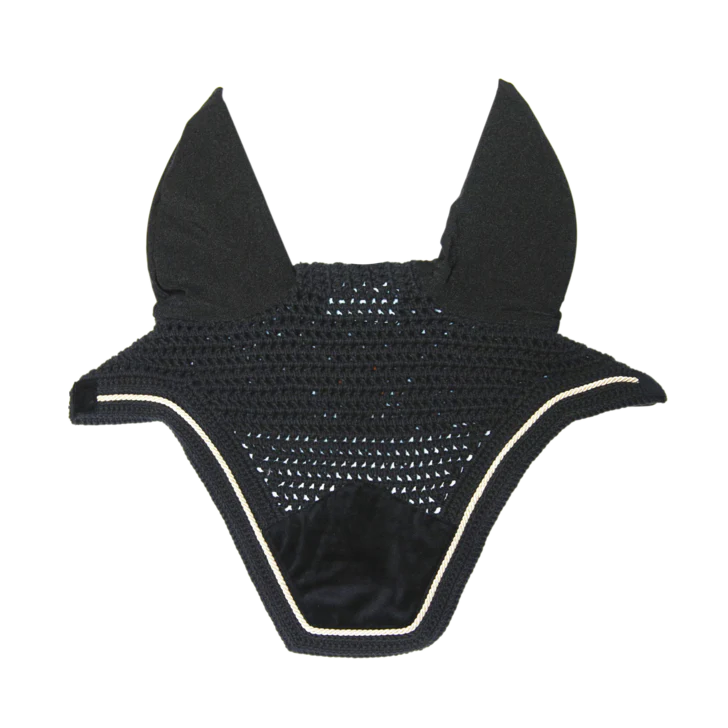 Ce bonnet est crocheté à la main pour une meilleure durabilité. Il possède des détails en velvet très élégants. Le tissu autour des oreilles est extensible et ajusté. Il protège les oreilles du cheval contre les mouches pendant le travail. La partie au niveau du cou est plus longue et ne peut donc pas glisser. Ce bonnet n’a pas de logo visible, le cavalier ou les sponsors peuvent donc broder leur propre logo. Lavage à la main uniquement.