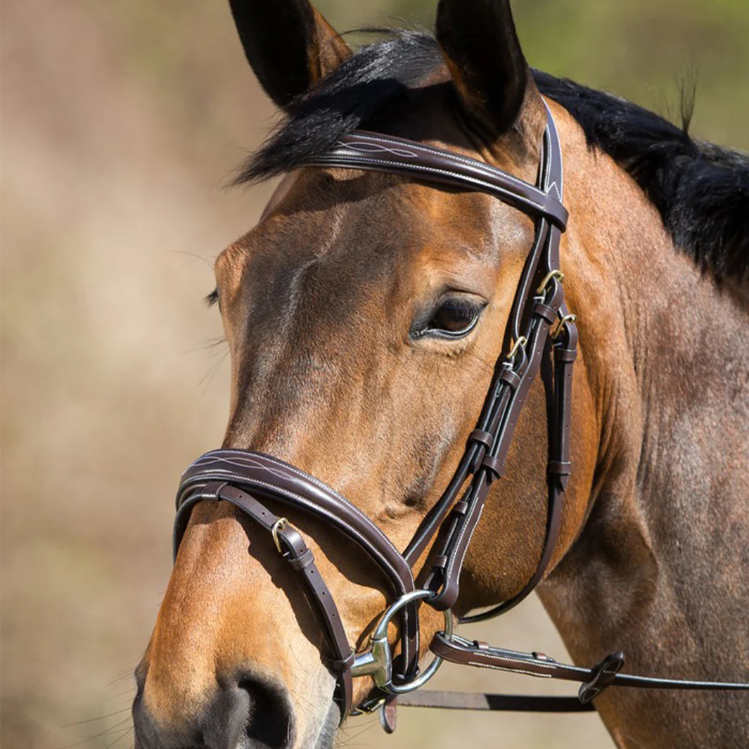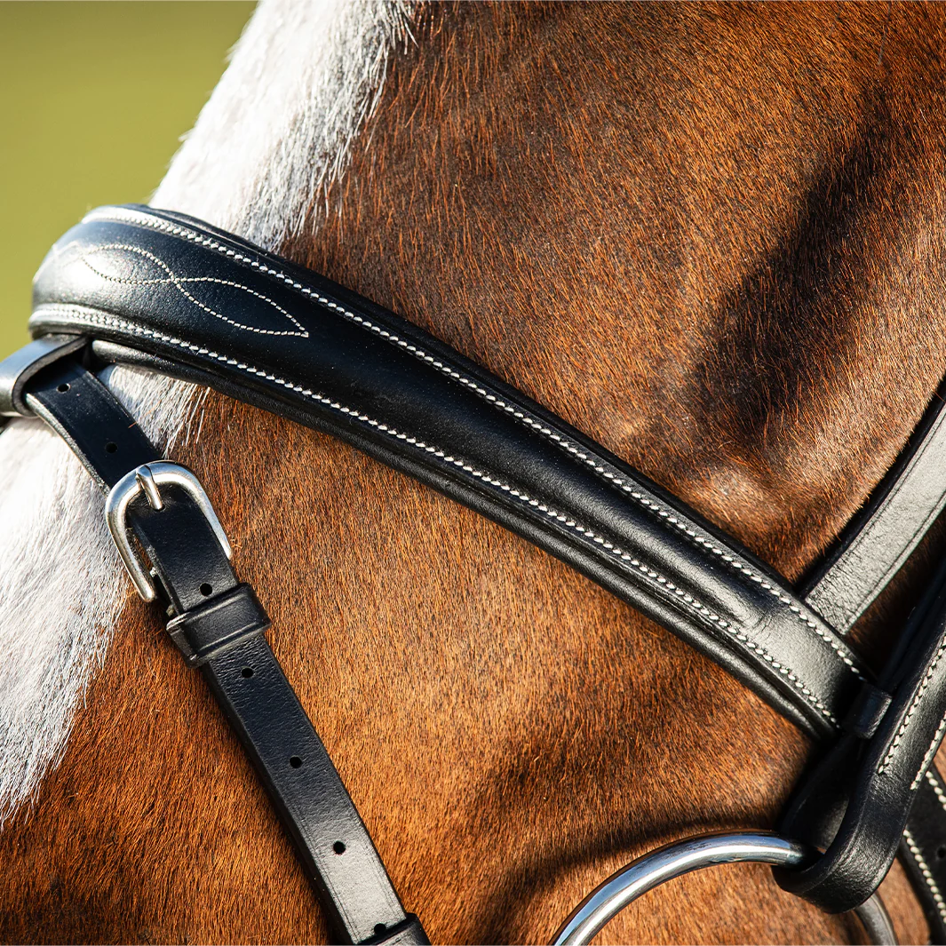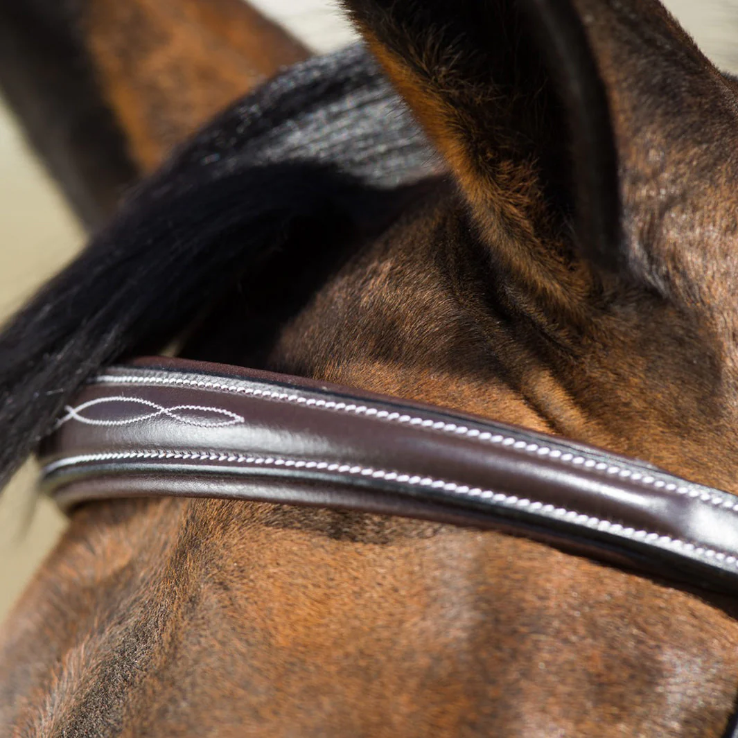 - Frontal et muserolle rembourrés et doublés de cuir souple garantissant un contact doux et réactif, sans irritation sur la peau.