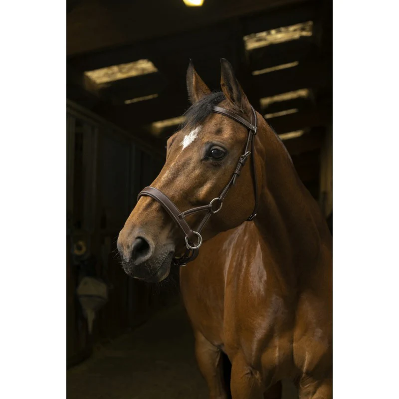Side-pull en cuir de buffle. Muserolle et frontal doublés en cuir vachette. Coutures blanches. Boucle en inox. Vendu sans rênes.