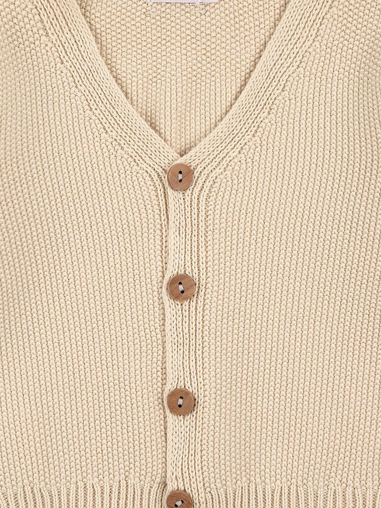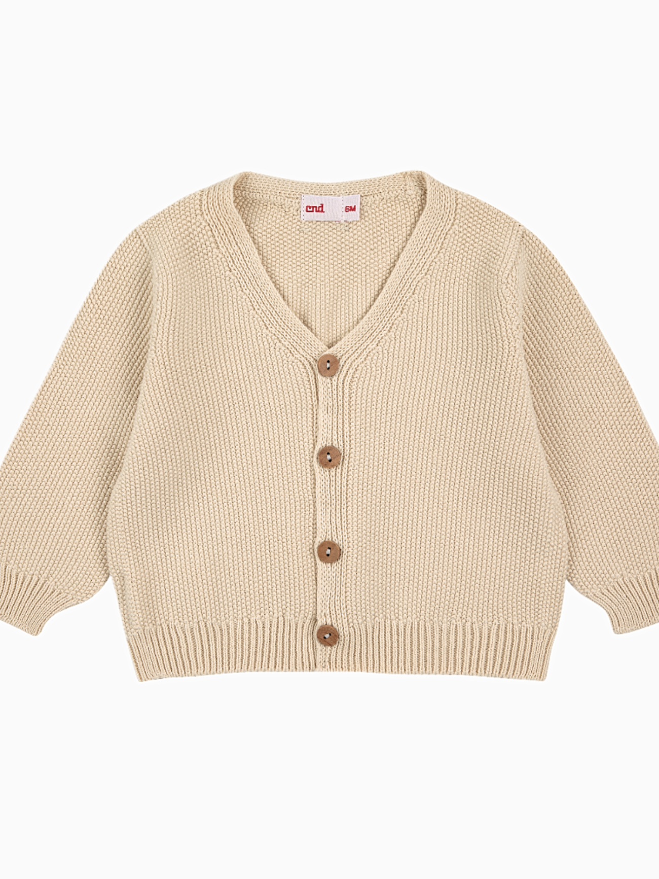 Ce modèle intemporel, avec son coloris beige, incarne le raffinement. Sa coupe pratique avec des boutons sur le devant permet un habillage facile, idéal pour les parents actifs. Ce cardigan est conçu pour accompagner les mouvements de bébé tout en maintenant une allure élégante. Portez-le par-dessus une robe, un bloomer ou un ensemble léger pour une touche finale sophistiquée et pleine de charme.