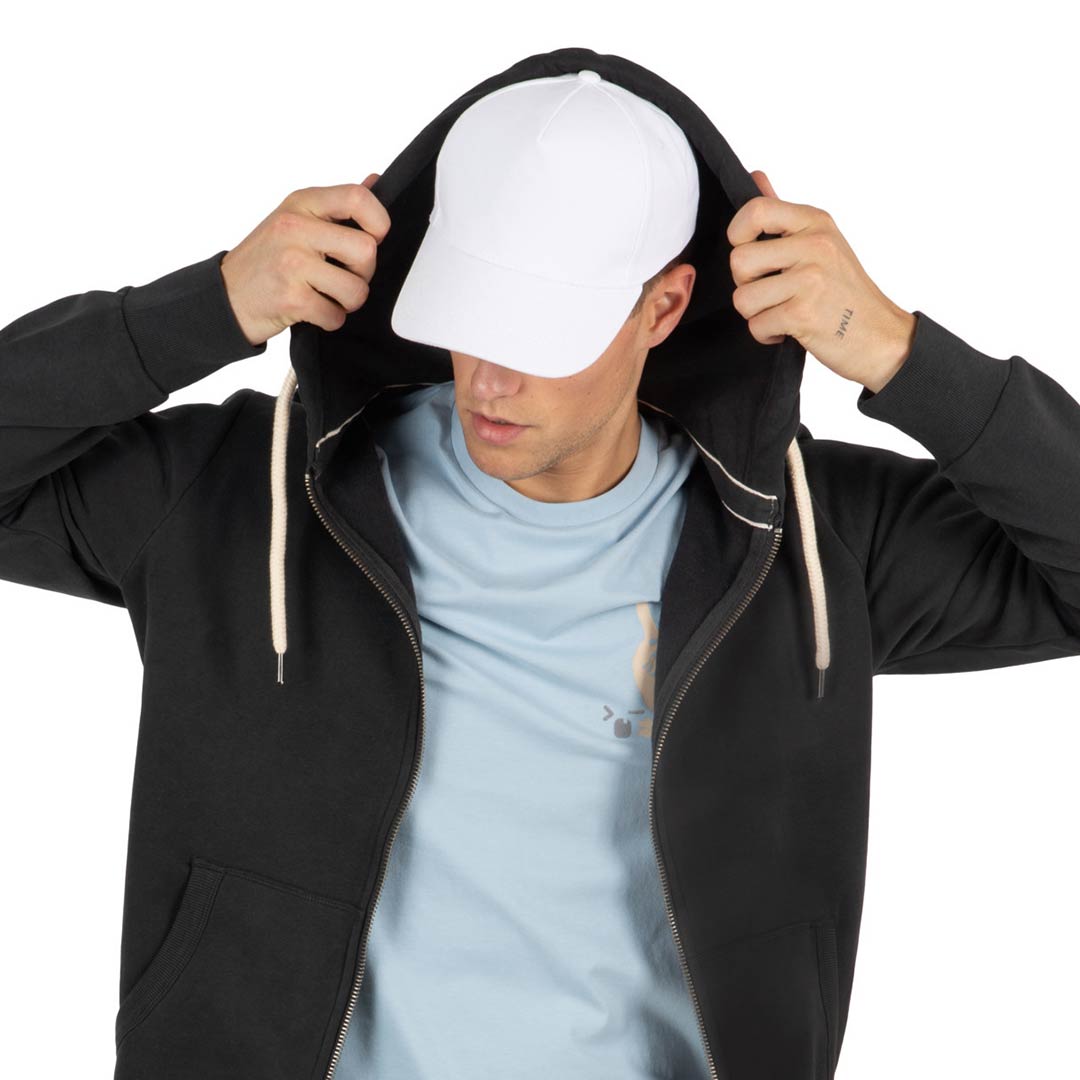 100% coton peigné épais. Casquette 5 panneaux. Fermeture arrière avec boucle métallique. Certifiée Oeko-Tex. Certifié STANDARD 100 by OEKO-TEX®N° CQ1007/8, IFTH.
