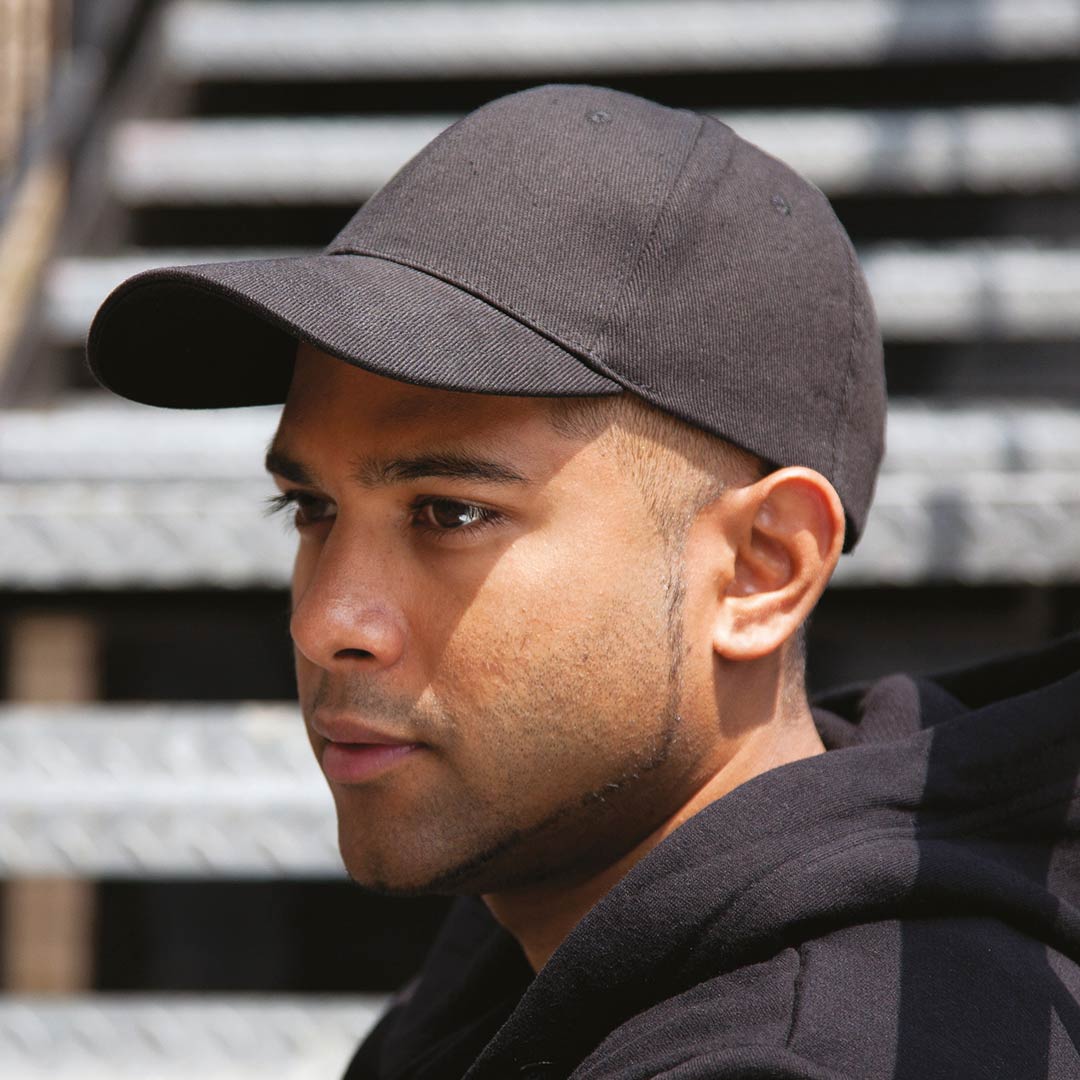 100% coton brossé. 6 panneaux avec panneau frontal renforcé, petit profil. Visière en PU recyclé courbée avec 6 surpiqûres. Œillets. Taille ajustable avec fermeture auto-agrippante. Étiquette détachable. Convient pour la broderie et au transfert numérique