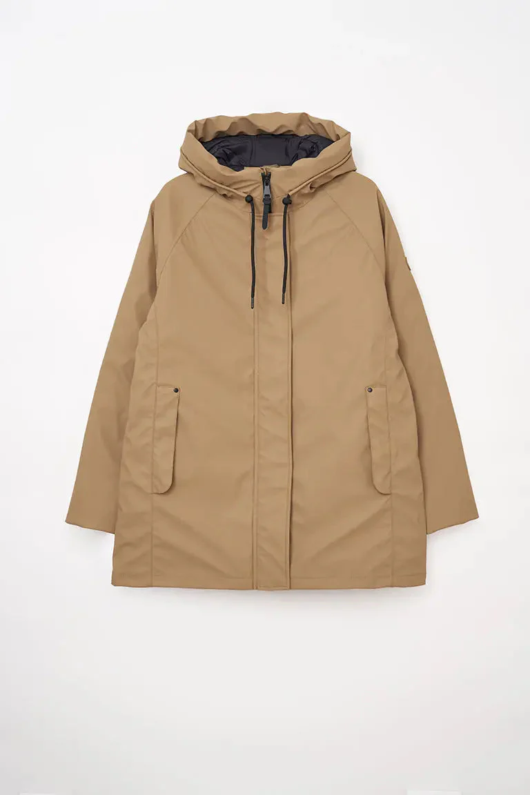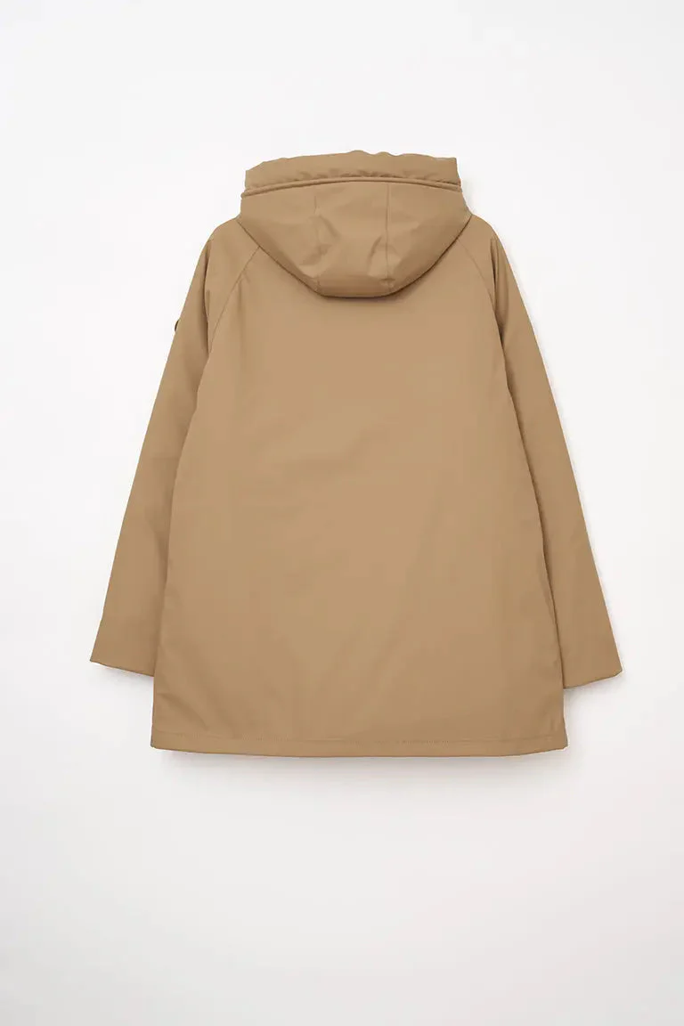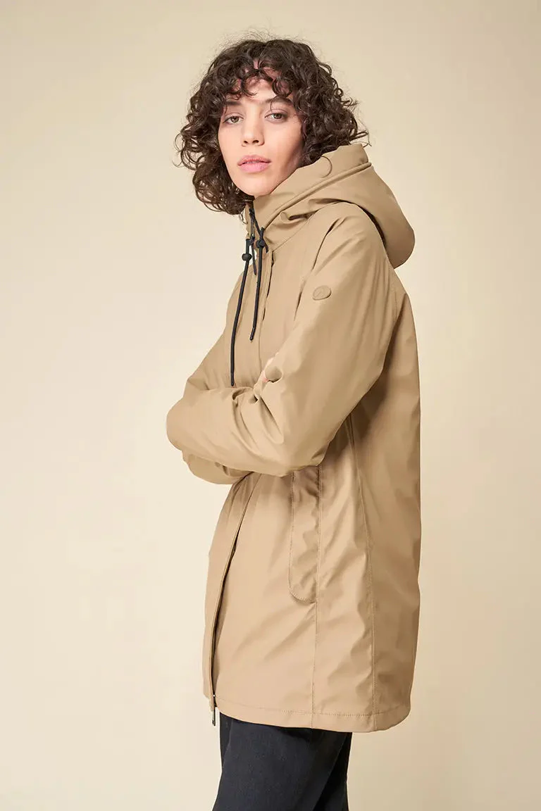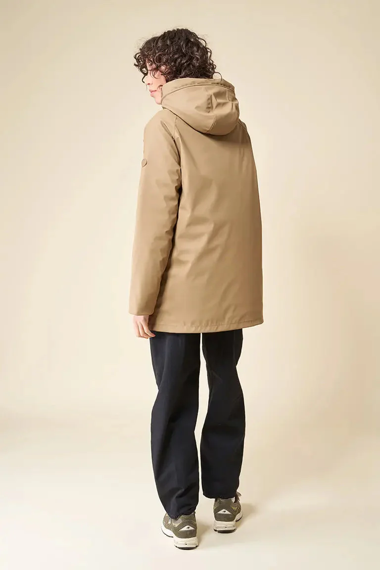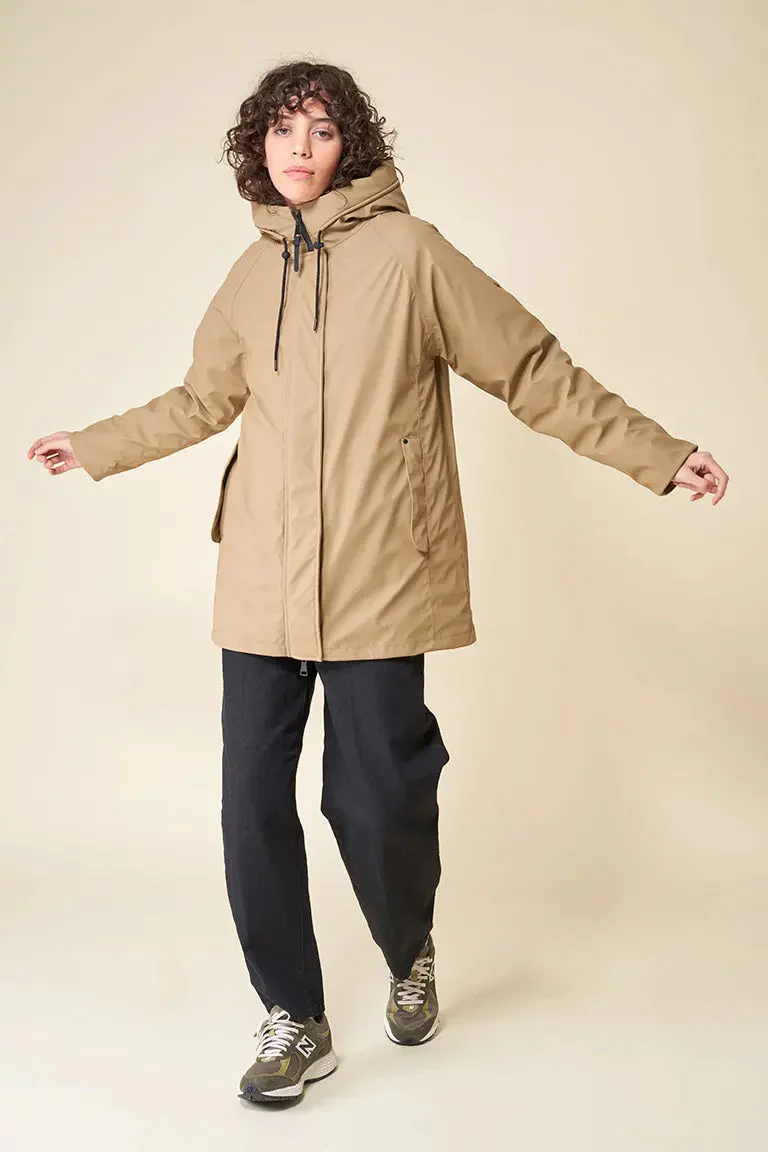 Diseñado para una mujer contemporánea en una ciudad dinámica. Impermeabilización total gracias a las costuras selladas; resistente al viento y aislante al frío gracias al interior de fibras de poliéster entrelazadas. Se ajusta a la talla real.