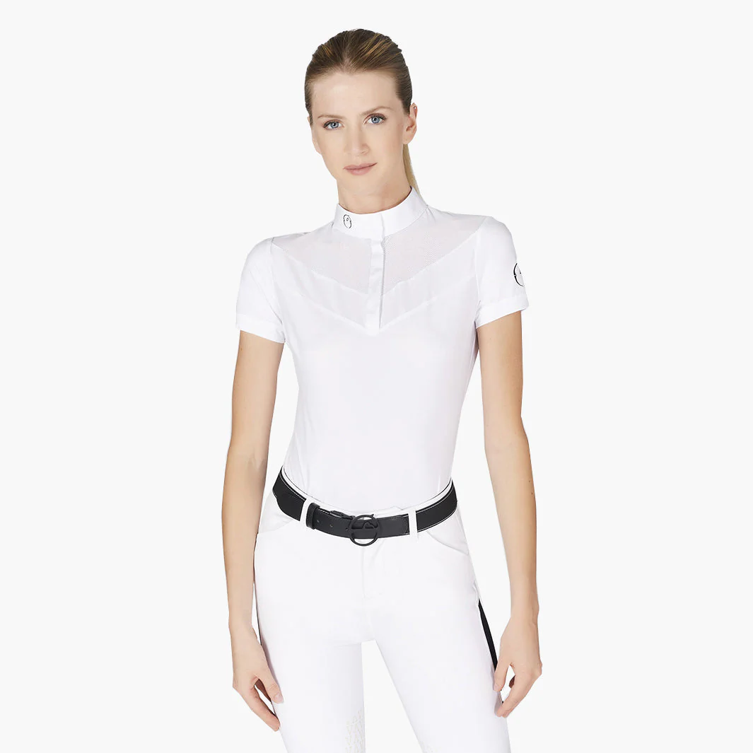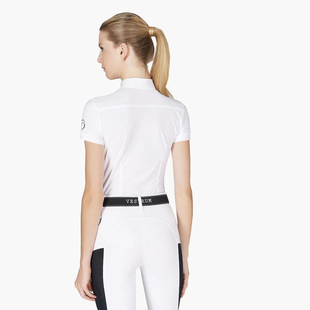 CHEMISE DE COMPÉTITION POUR FEMME SIMERI | VESTRUM : La chemise de compétition à manches courtes pour femme Simeri est faite de tissu technique respirant et extensible à séchage rapide. Chemise caractérisé par des inserts en maille respirante. Le design classique offre un confort et un style imbattables, parfaits pour concourir avec votre cheval avec style pendant la saison chaude.