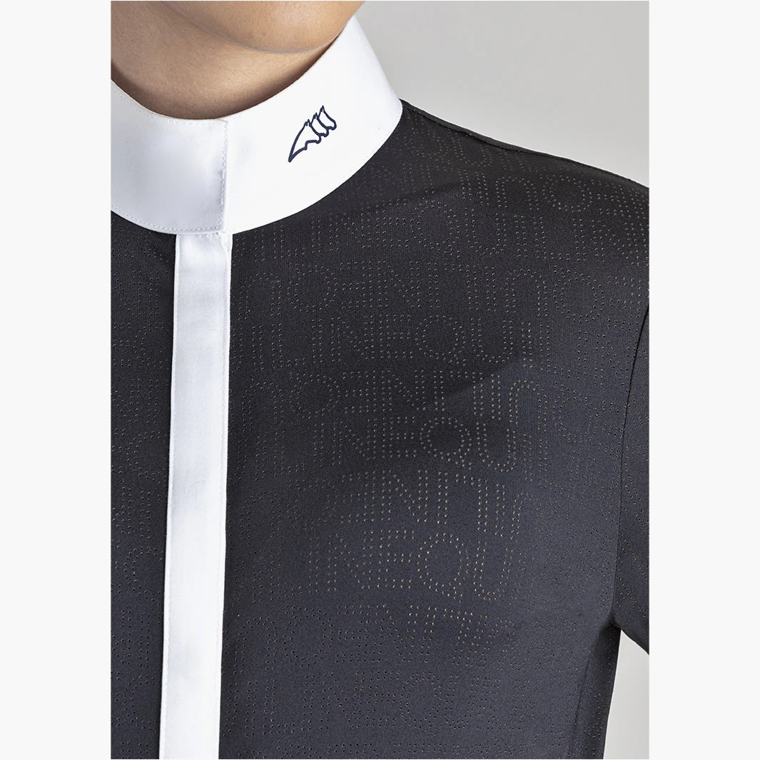 Chemise de compétition élastique et respirante pour femme. Caractérisée par des boutons invisibles, un motif à micro-trous (mot « equiline ») et un séchage rapide. Col, patte et poignets de couleur contrastée. Élégance et performance en un seul vêtement. Parfaite pour la mi-saison.