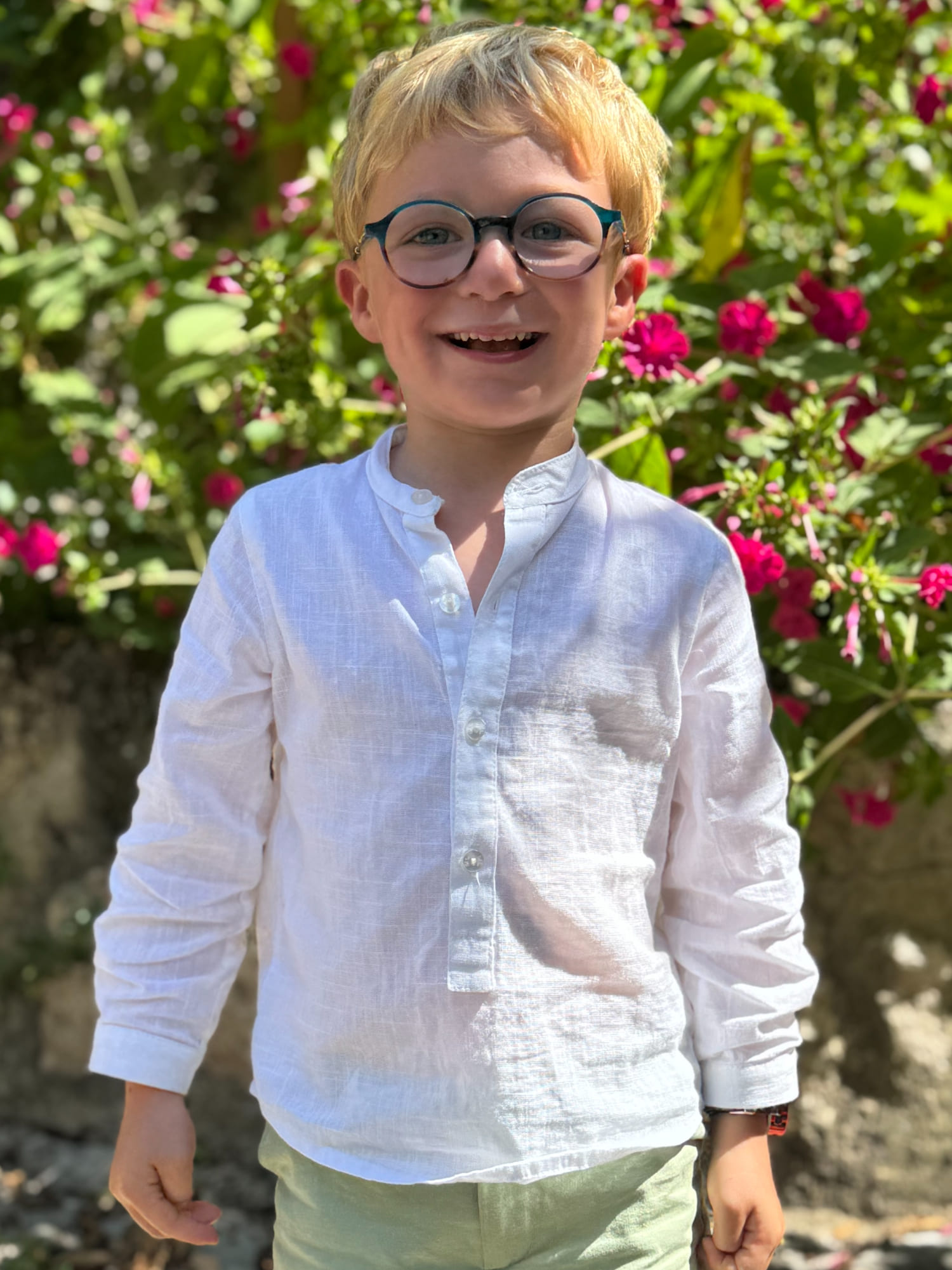Fabriquée avec soin, cette chemise garçon légère blanche élégante à col mao reflète un savoir-faire de qualité, garantissant durabilité et confort. Offrez à votre enfant une pièce incontournable qui allie tradition et modernité, tout en sublimant son allure.