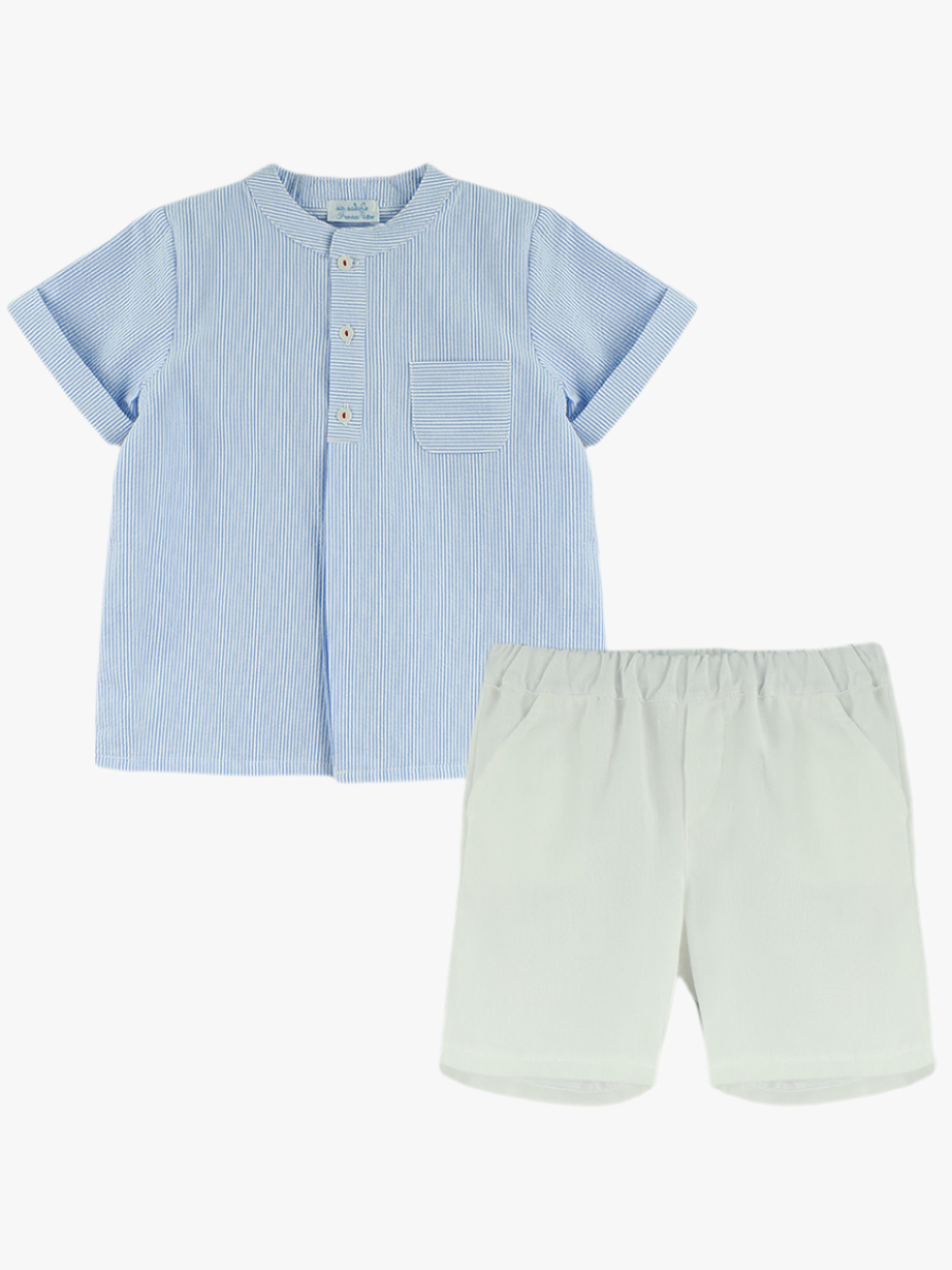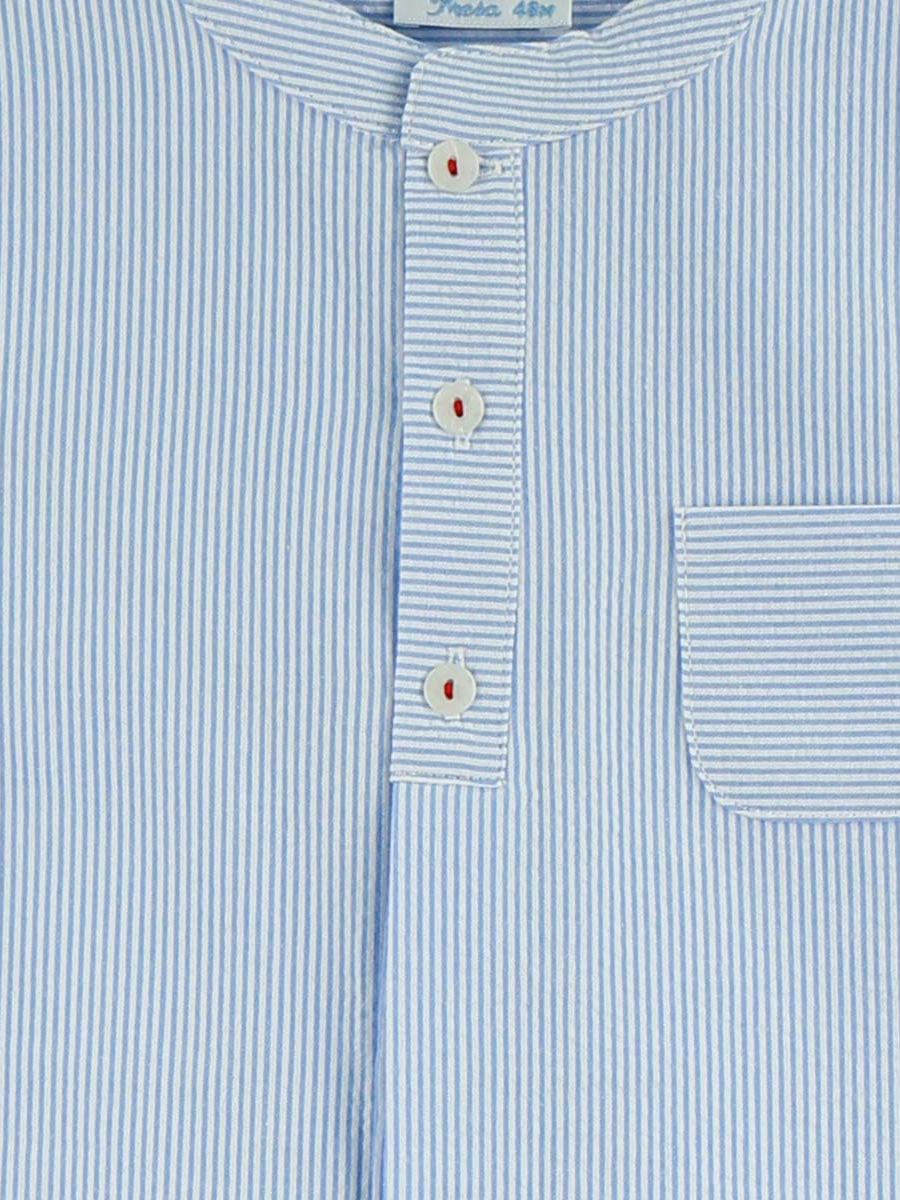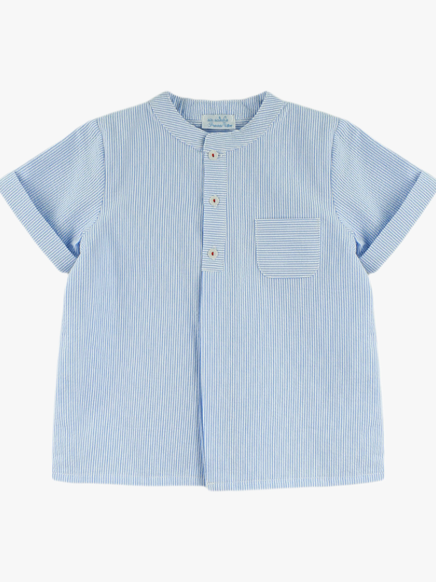 Chemise garçon manches courtes à col mao rayée – Bleu ciel/blanc