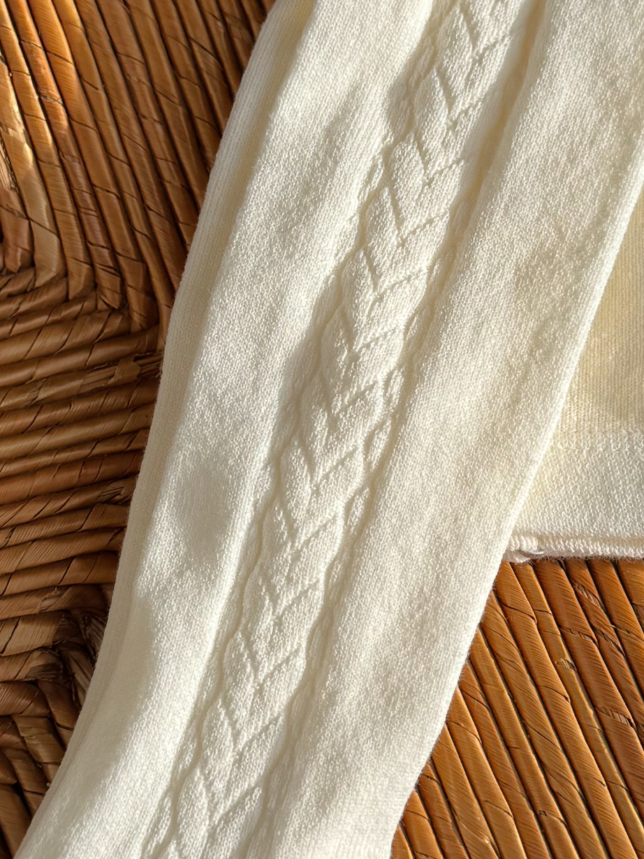 Son détail de torsade discrète le long des jambes confère à ce collant un charme particulier tout en restant facile à assortir. La torsade latérale structure la jambe et donne un petit effet raffiné qui rappelle l’élégance d’autrefois, tout en s’inscrivant parfaitement dans un style enfantin et intemporel. C’est ce détail qui fera la différence sur vos photos de famille ou lors des promenades du week-end.