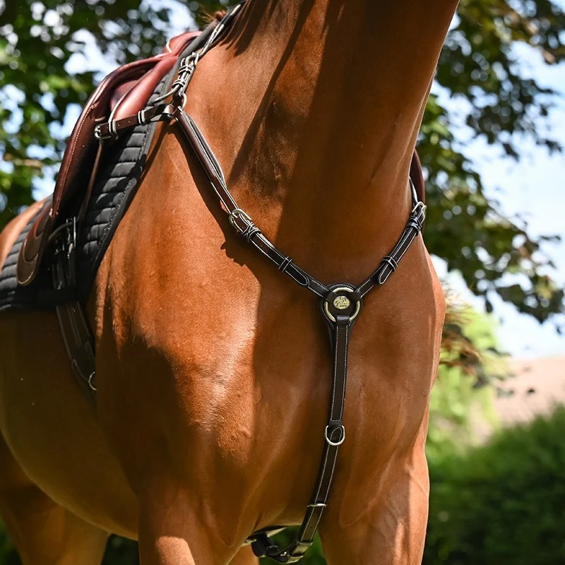 Assorti au bridon Wednesday, ce collier de chasse s’attache aux contre-sanglons de la selle et on y retrouve le petit motif fancy en contraste et le liseré verni. Le collier de chasse permet de garder la selle en place tout au long de la séance de façon à ce qu’elle ne recule pas.