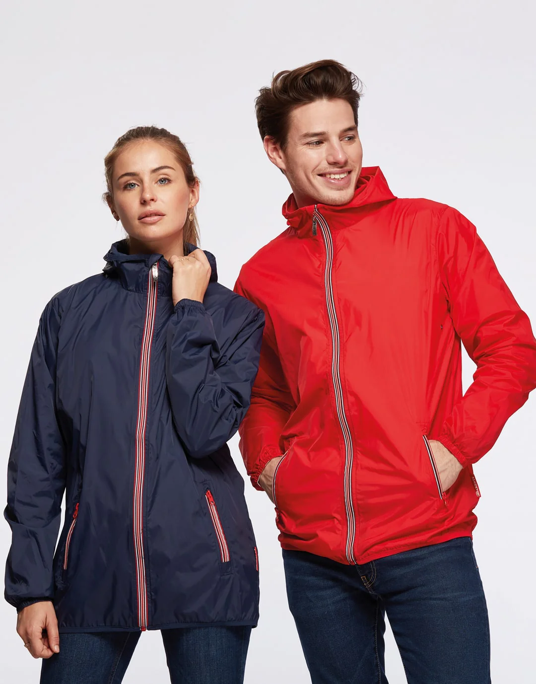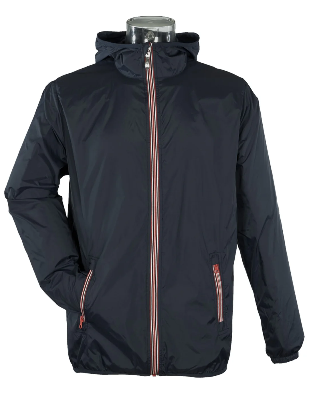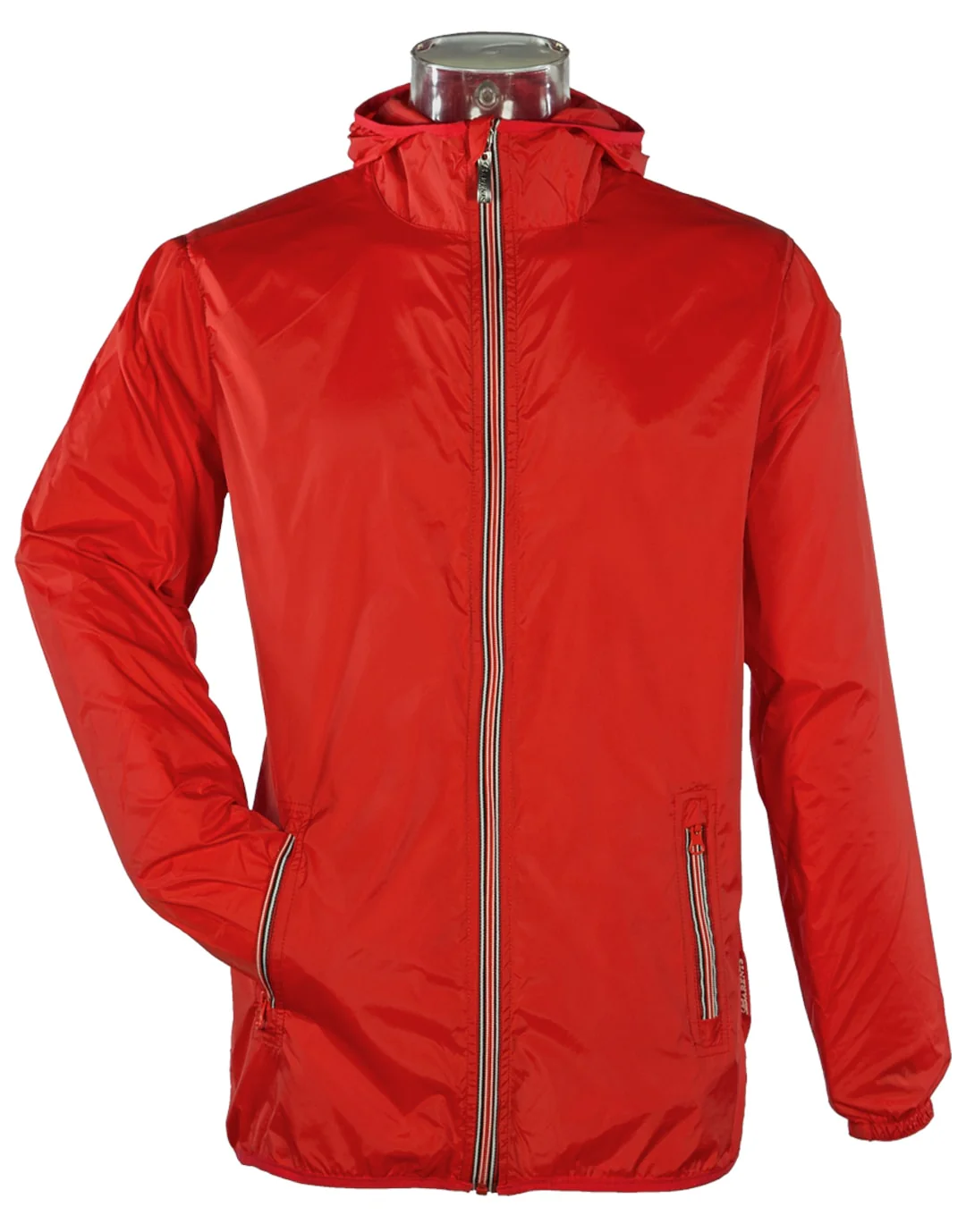 Coupe-vent 100% nylon enduit imperméable. Zip central tricolore. 2 poches zippées. Poignets élastiqués réversibles avec bande réfléchissante intérieure. Le coupe-vent se plie dans sa propre poche pour pouvoir se transporter facilement.