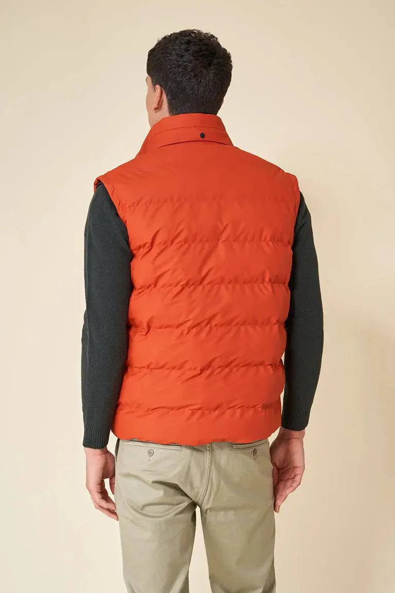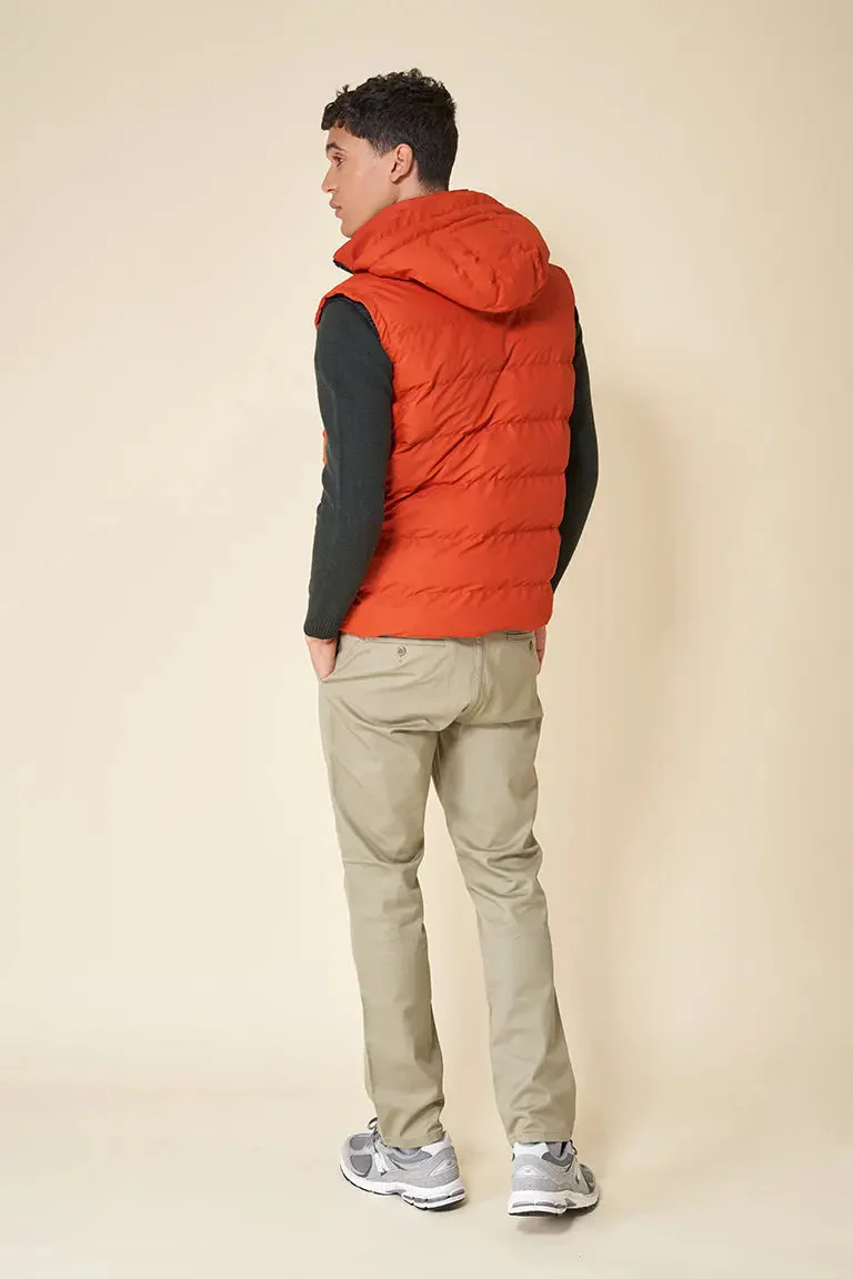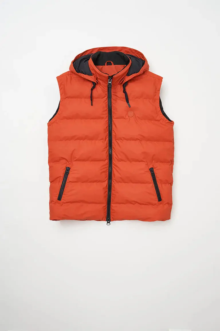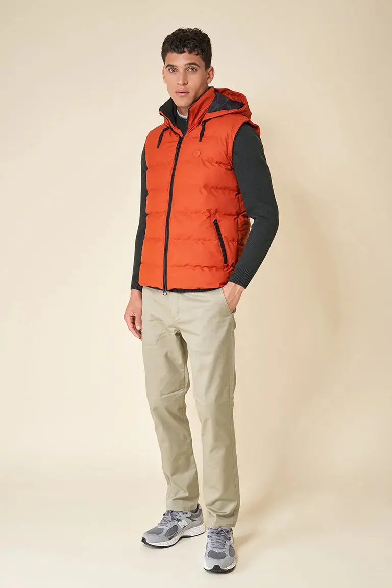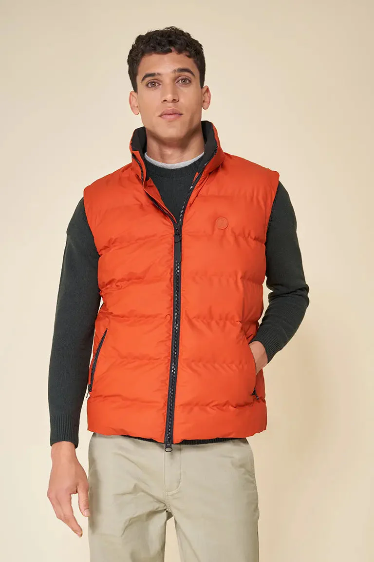 Enfréntate al clima de entretiempo con estilo con el chaleco impermeable acolchado de hombre Dam. Confeccionado con poliuretano resistente al agua y acolchado con una capa de aislamiento sin plumas, cuenta con cámaras sin costuras, grandes cremalleras de resina en la parte delantera y en los bolsillos, y una capucha con cordón desmontable. Se ajusta a la talla real.