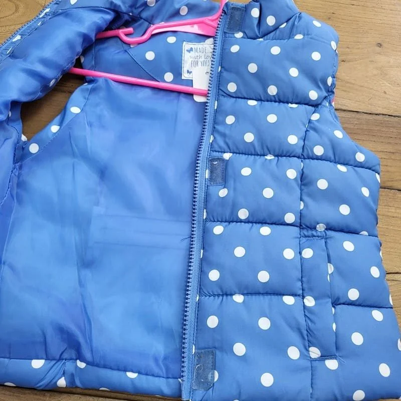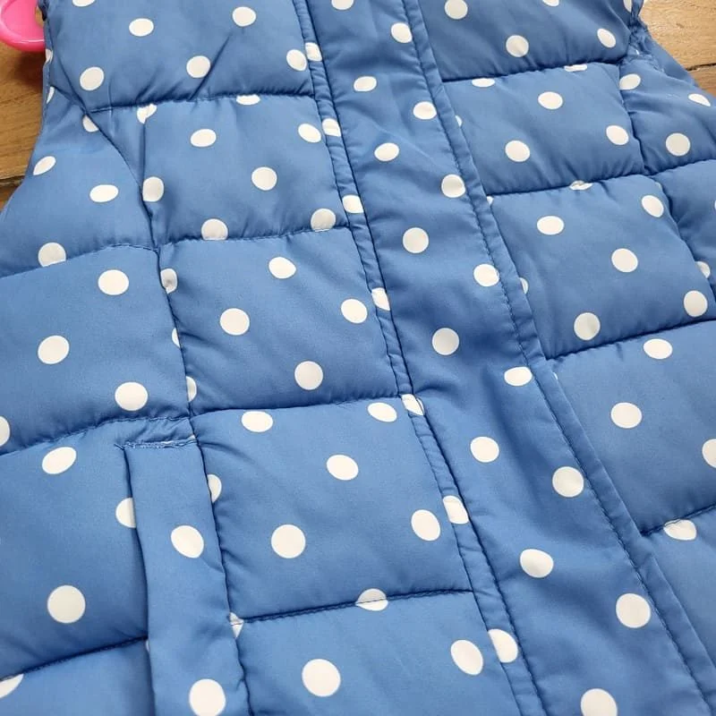 Doudoune sans manches fille 24/36 mois, bleu à pois blancs, légère et confortable. Idéale pour la mi-saison, elle garde votre enfant au chaud tout en offrant une grande liberté de mouvement. Un vêtement de seconde main vérifié, pratique et à petit prix.