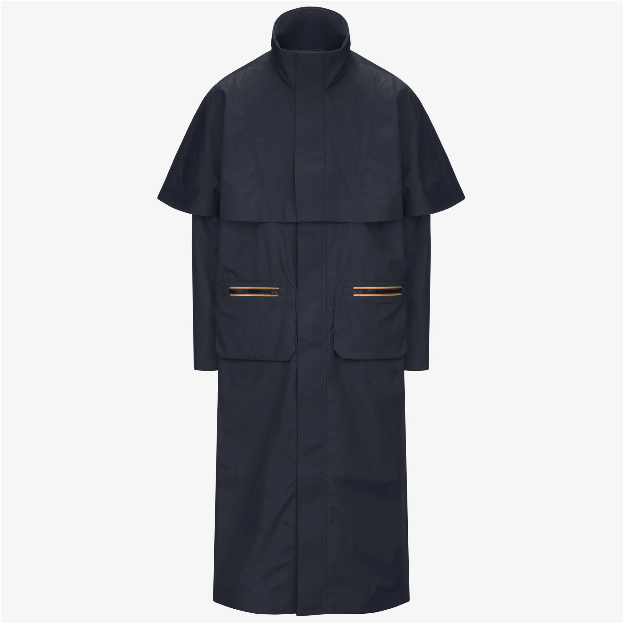 Effol est un manteau long pour homme qui réinvente la classique veste de pluie avec une touche moderne et superposée. Parfait pour les saisons de transition, il est fabriqué en nylon ripstop, avec une membrane isolante et une doublure en jersey mélangé laine pour un confort accru. Le design présente un col haut, des poignets réglables, une fermeture éclair à double curseur avec rabat tempête à boutons-pression, et une mise à jour distinctive des poches ‘packables’ emblématiques de K-Way®, repositionnées à l’avant comme des détails fonctionnels et affirmés, finies avec une fermeture éclair contrastée dans les couleurs emblématiques de la marque. Une cape d’épaule intégrée ajoute un effet superposé sophistiqué.