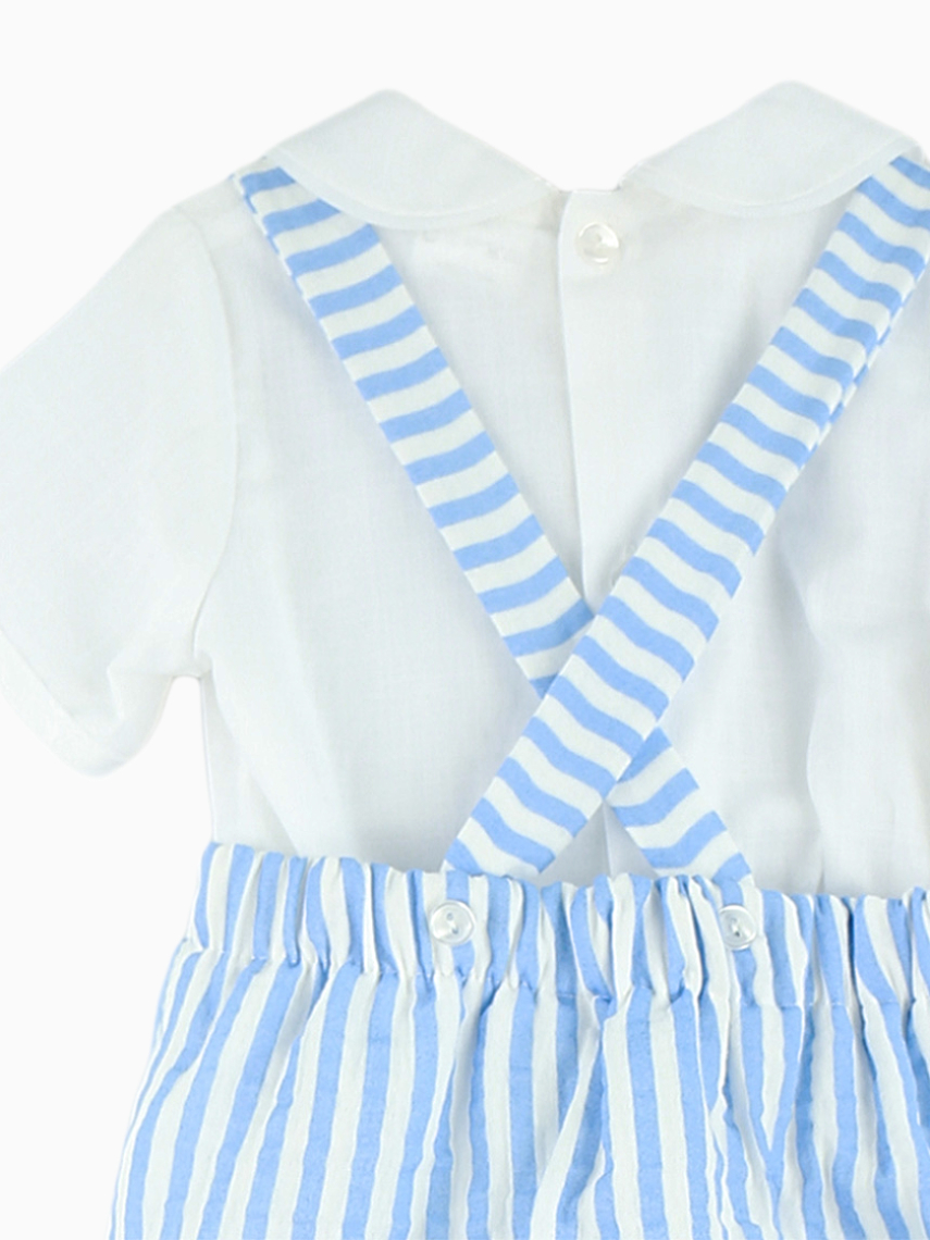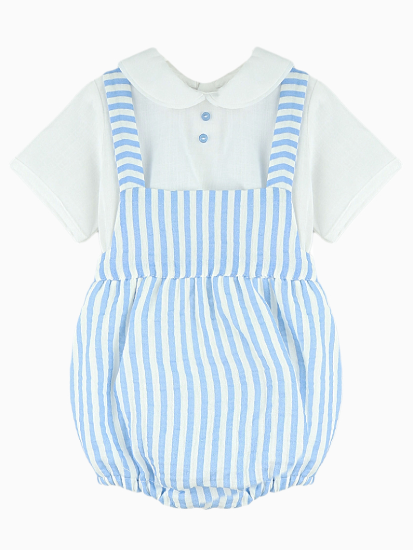 Plongez dans l’univers du style classique et raffiné avec notre ensemble barboteuse rayée et blouse blanche, une tenue élégante et intemporelle pour habiller votre petit garçon avec charme. Conçu avec le plus grand soin, cet ensemble associe une barboteuse rayée bleu ciel et blanc à bretelles croisées dans le dos et une blouse blanche délicatement travaillée, pour un look à la fois chic et confortable.