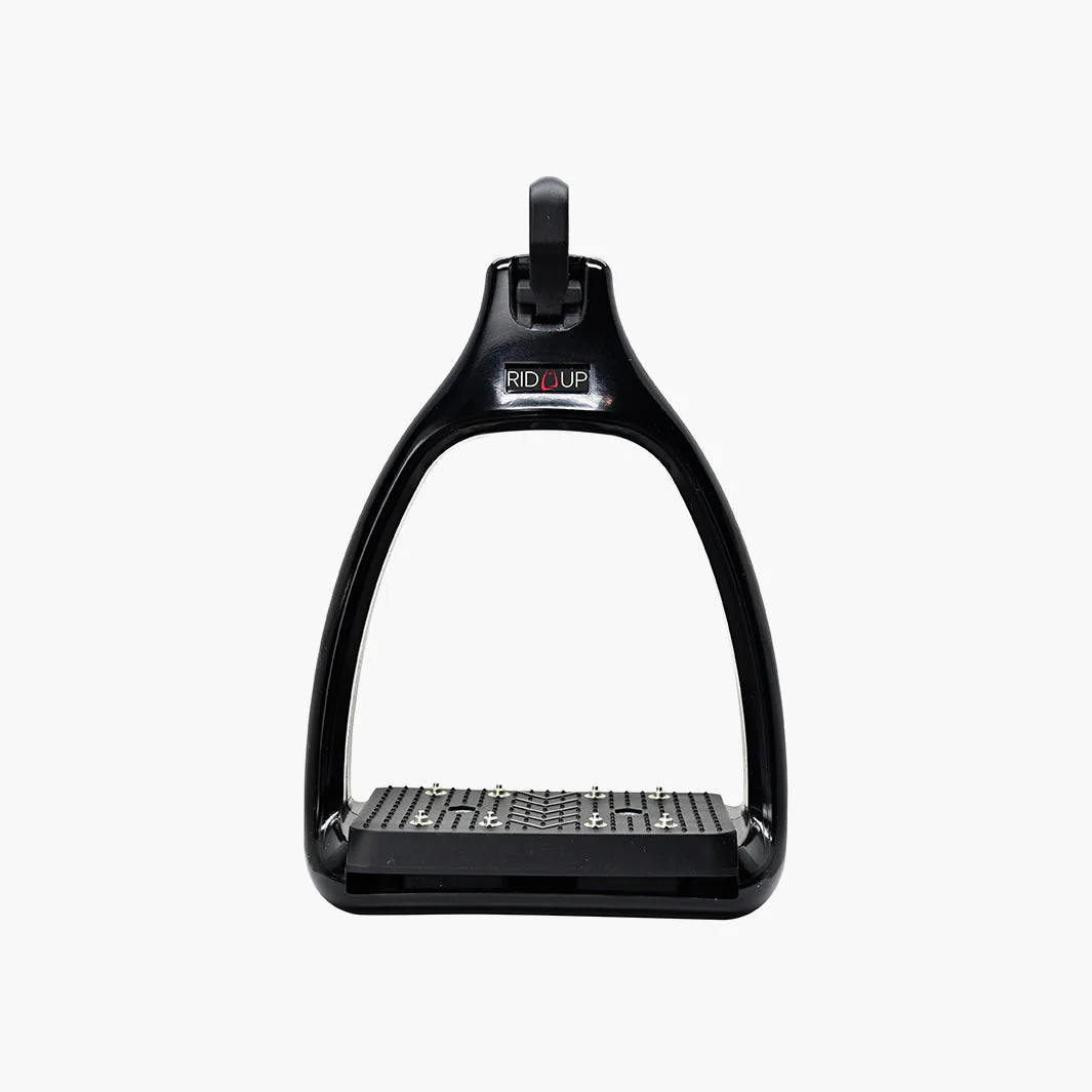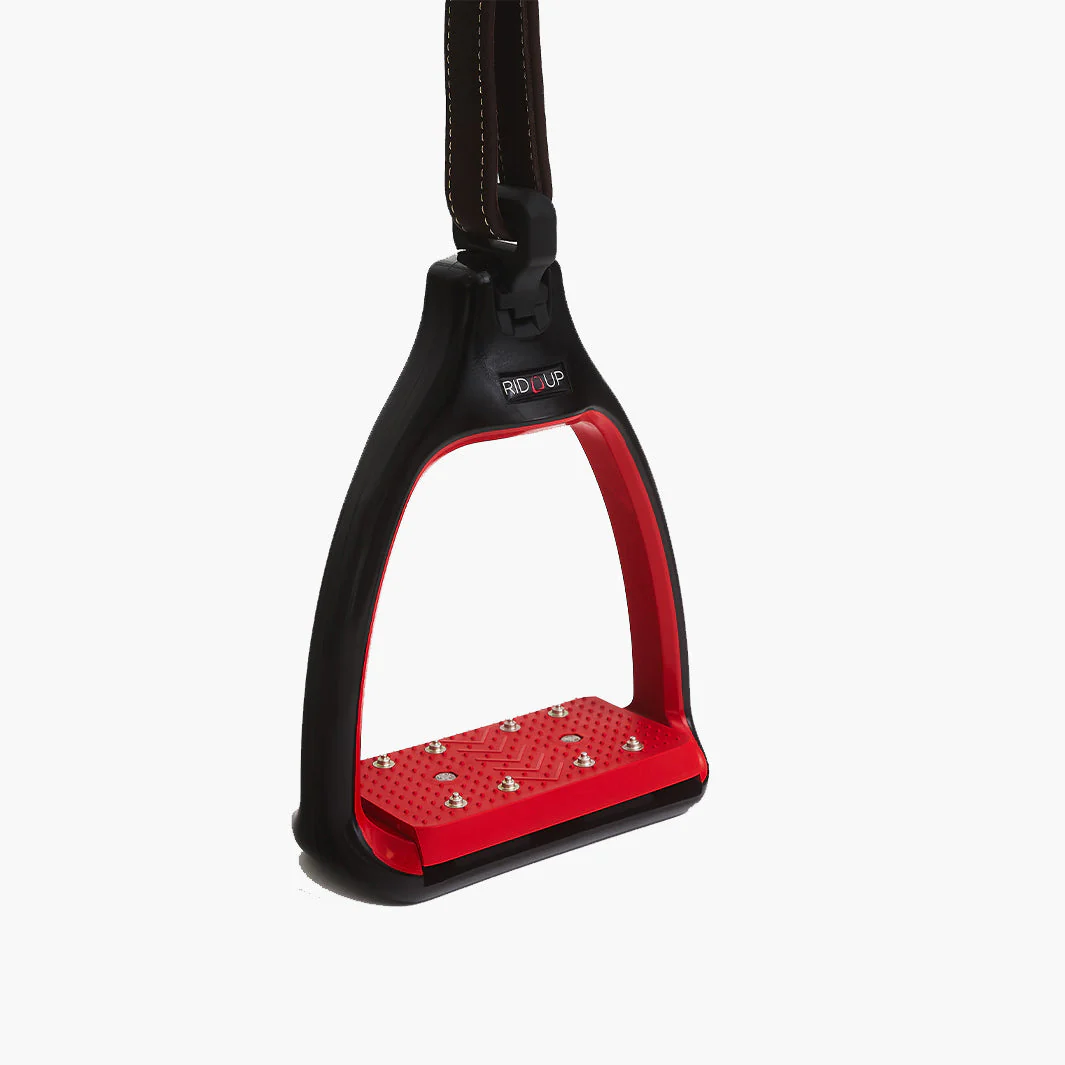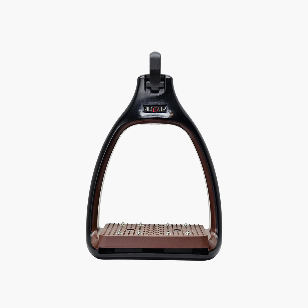 Le plancher est doté d’un amorti efficace grâce à une semelle élastomère, qui absorbe les chocs et réduit la fatigue lors des longues séances ou des descentes techniques. L’étrier est plat sur le quartier de selle, favorisant un chausson discret et agréable sous le mollet. L’œil pérpendiculaire à l’étrier permet de chausser plus facilement Rid’Up et assure que les étriers restent perpendiculaires au cheval, offrant une stabilité et un contact chaussant optimisés.
