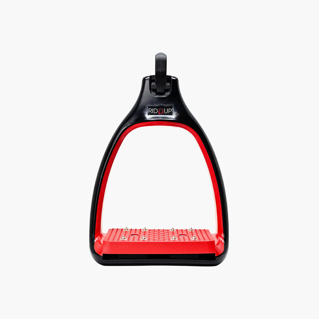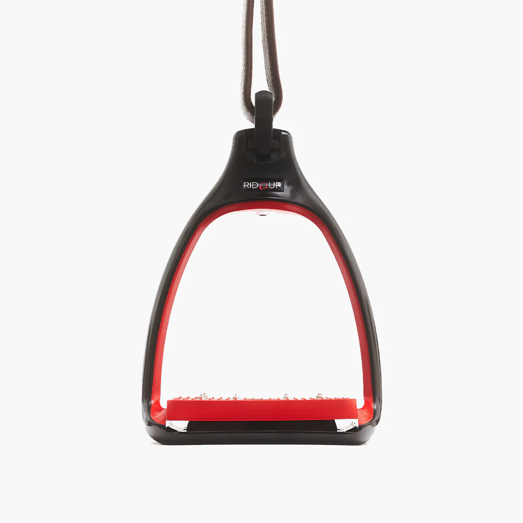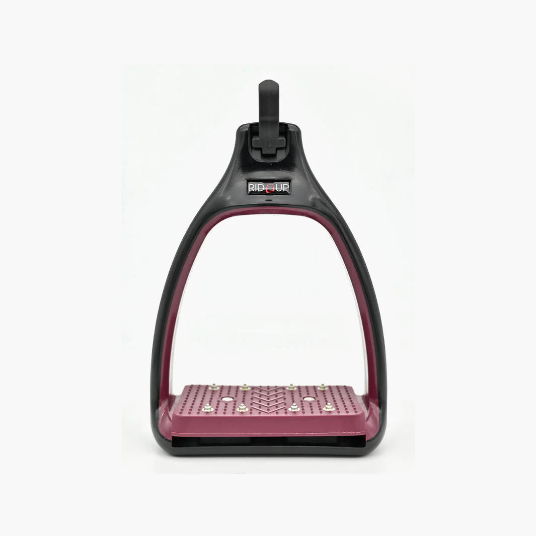 Le plancher est doté d’un amorti efficace grâce à une semelle élastomère, qui absorbe les chocs et réduit la fatigue lors des longues séances ou des descentes techniques. L’étrier est plat sur le quartier de selle, favorisant un chausson discret et agréable sous le mollet. L’œil pérpendiculaire à l’étrier permet de chausser plus facilement Rid’Up et assure que les étriers restent perpendiculaires au cheval, offrant une stabilité et un contact chaussant optimisés.