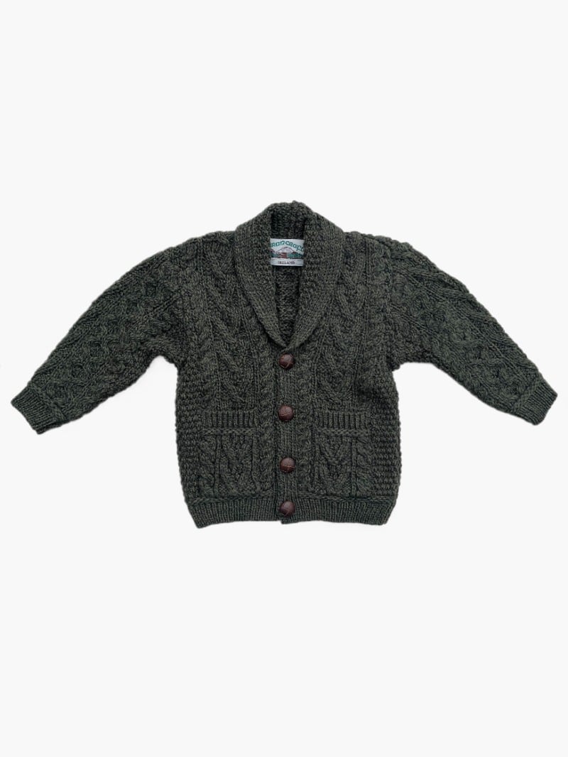 Le col châle, délicatement conçu, ajoute une touche de sophistication tout en protégeant le cou de votre enfant contre le froid. Le vert profond du gilet s’inspire des prairies verdoyantes et des collines d’Irlande, apportant une touche de fraîcheur et de nature à la garde-robe de votre bébé.