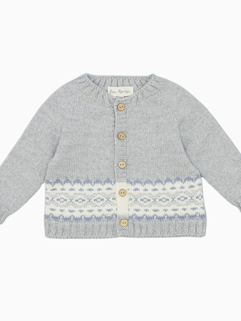 Notre gilet bébé mixte gris est une pièce intemporelle, idéale pour réchauffer les tenues de votre bébé avec élégance. Sa teinte gris pâle, rehaussée de motifs hivernaux bleu ciel et blanc cassé, apporte une touche délicate et poétique à son vestiaire.