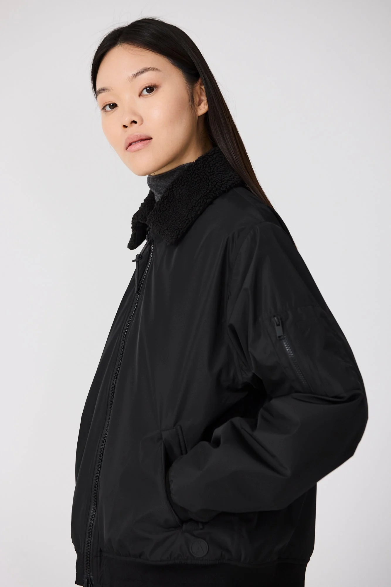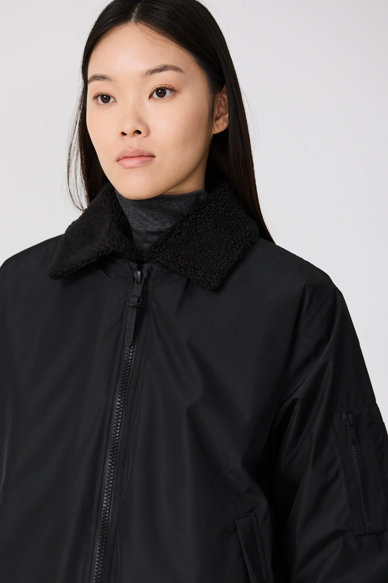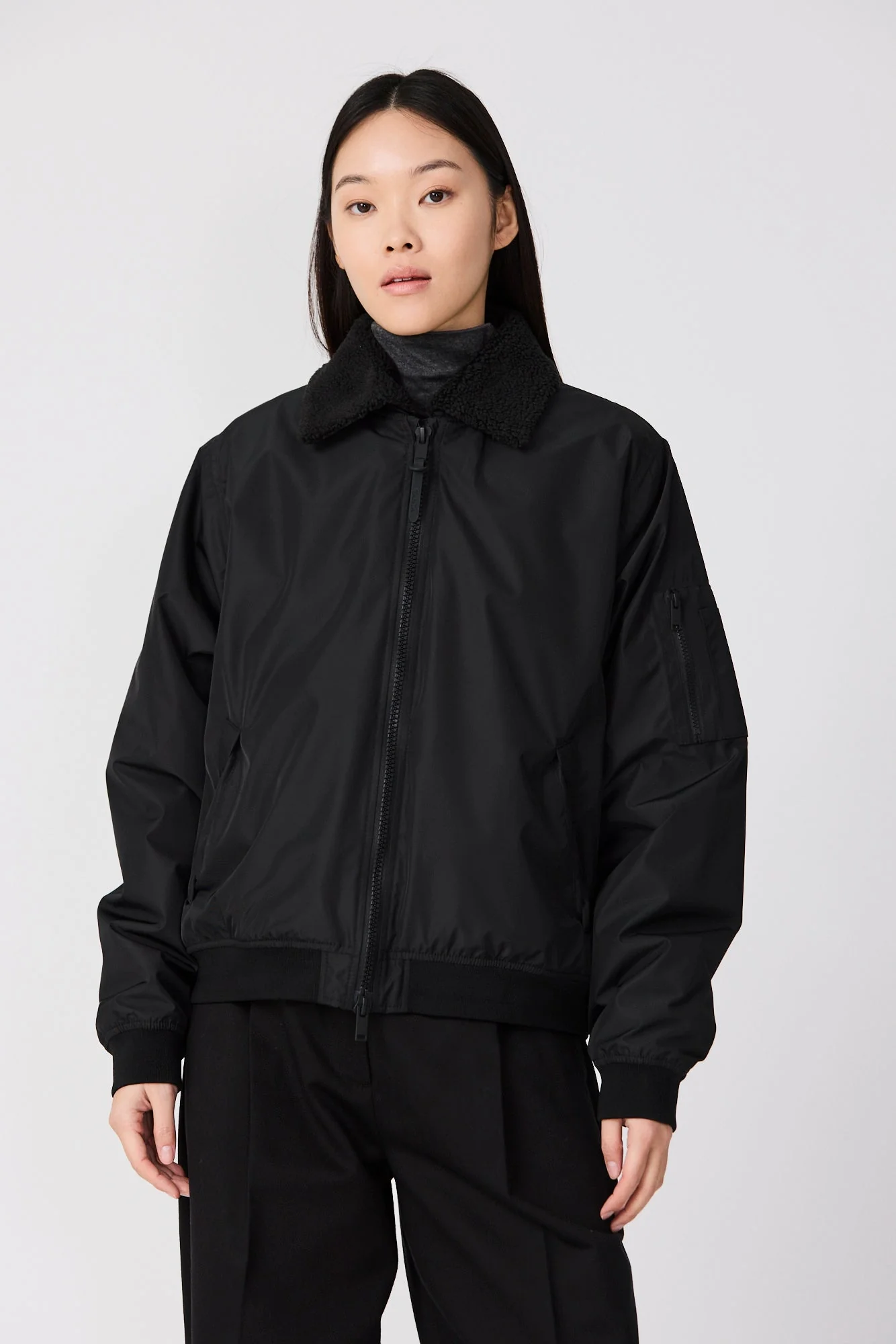 Los detalles de diseño incluyen bolsillos de ribete, puños y bajo de canalé, y una cremallera frontal impermeable de doble cursor. Un cuello de sherpa desmontable completa el look, añadiendo estilo y versatilidad.
