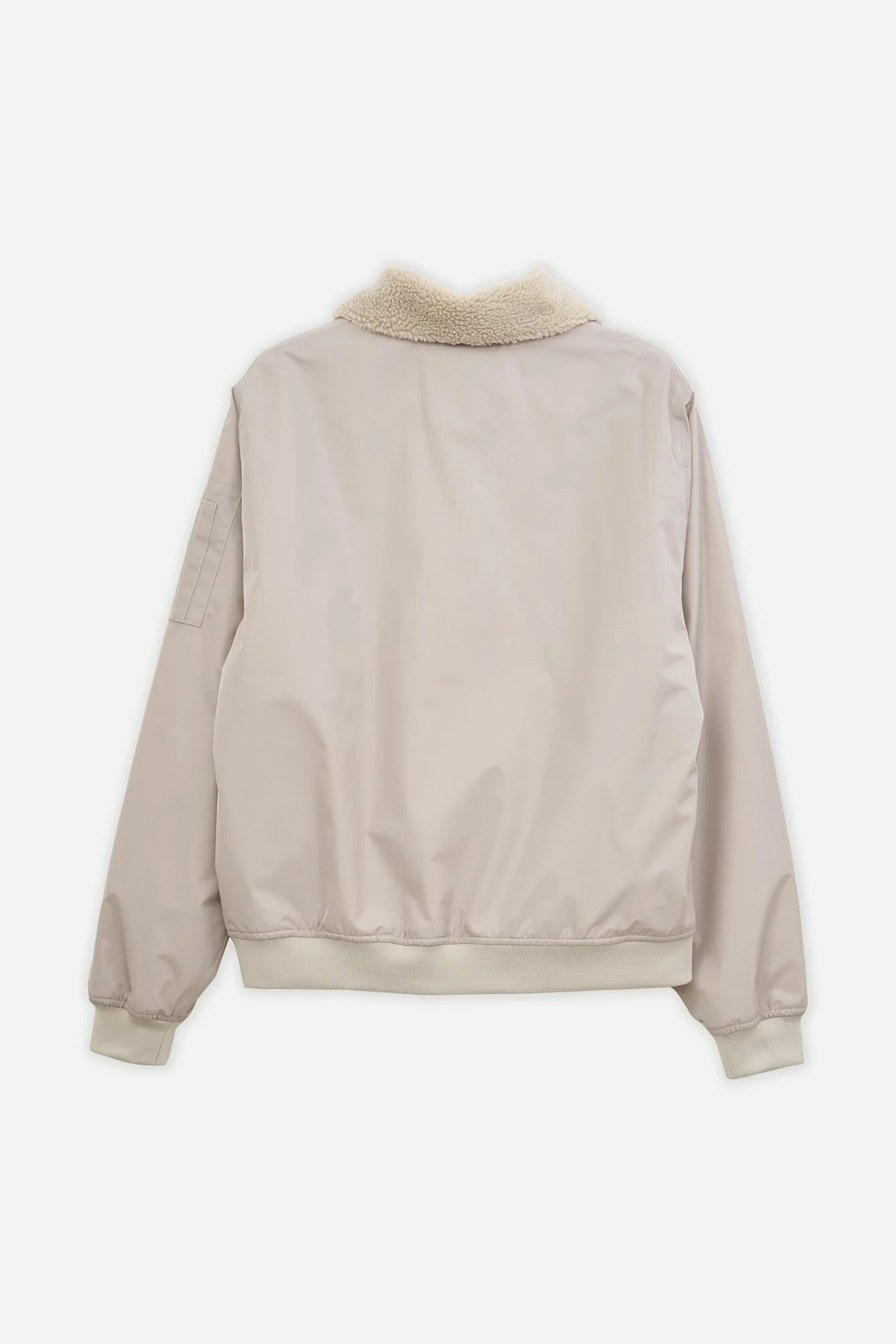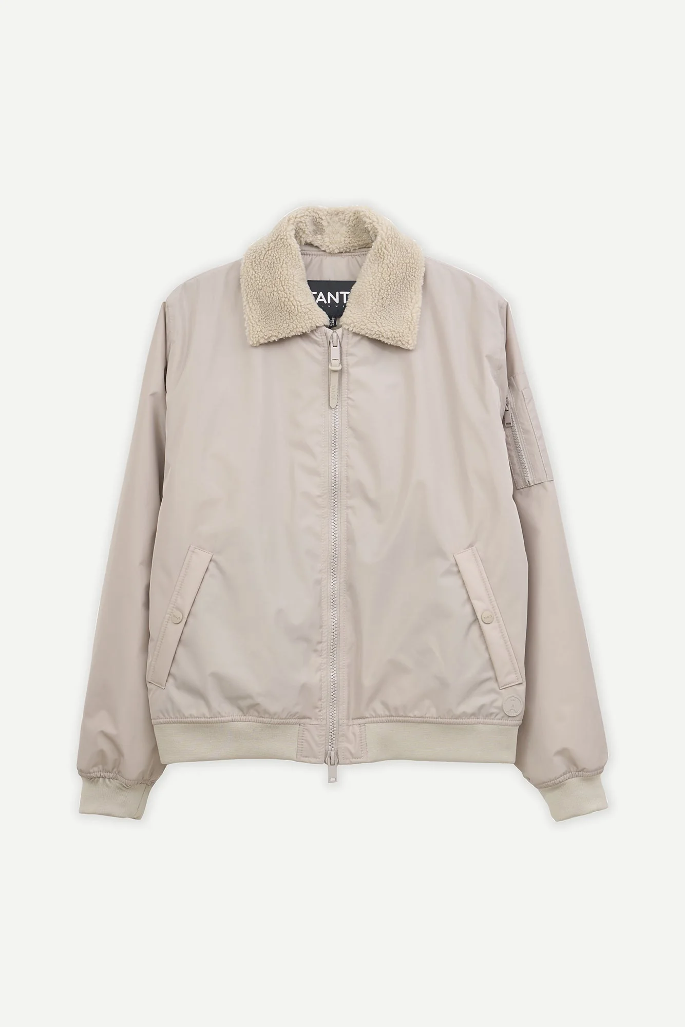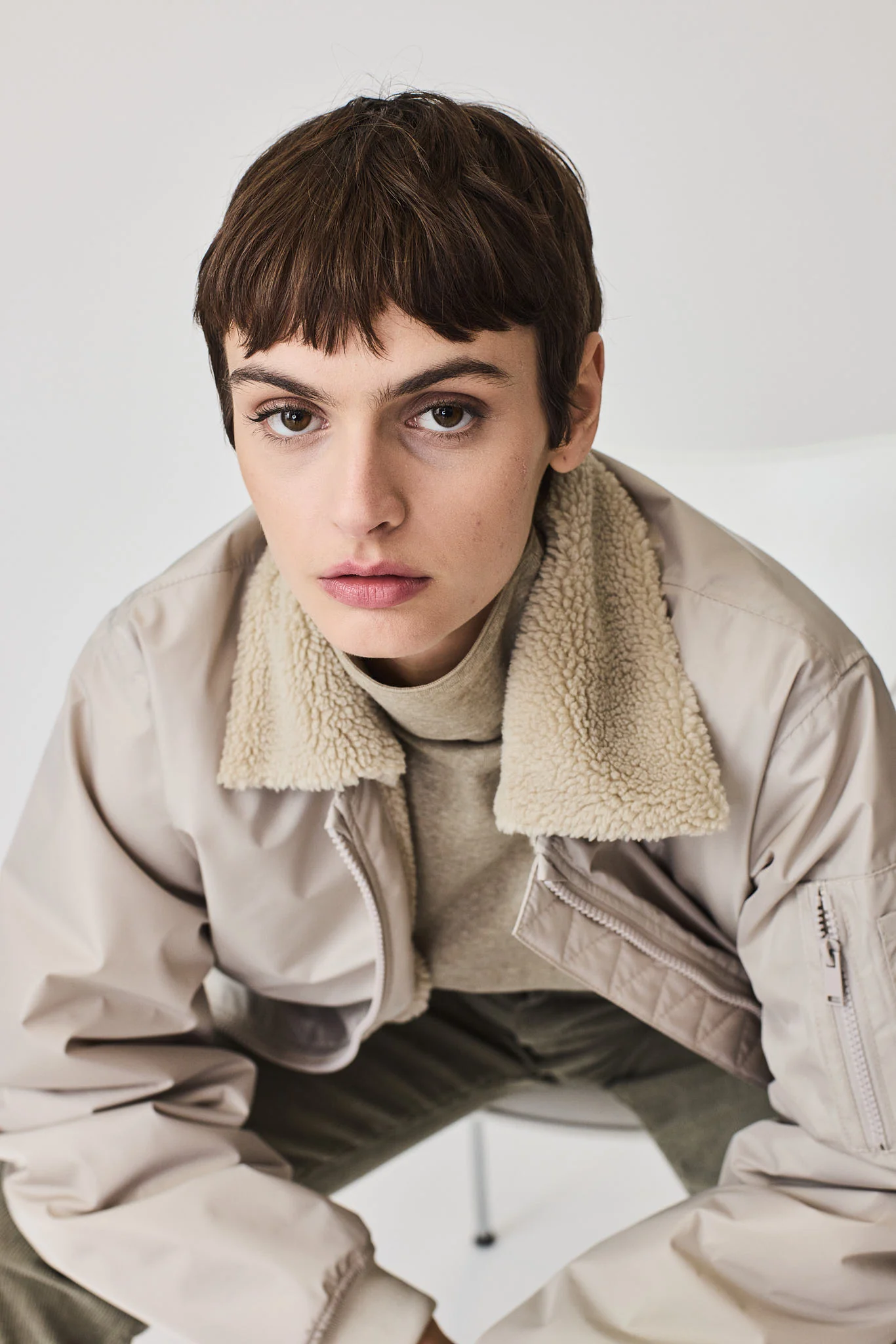 Los detalles de diseño incluyen bolsillos de ribete, puños y bajo de canalé, y una cremallera frontal impermeable de doble cursor. Un cuello de sherpa desmontable completa el look, añadiendo estilo y versatilidad.