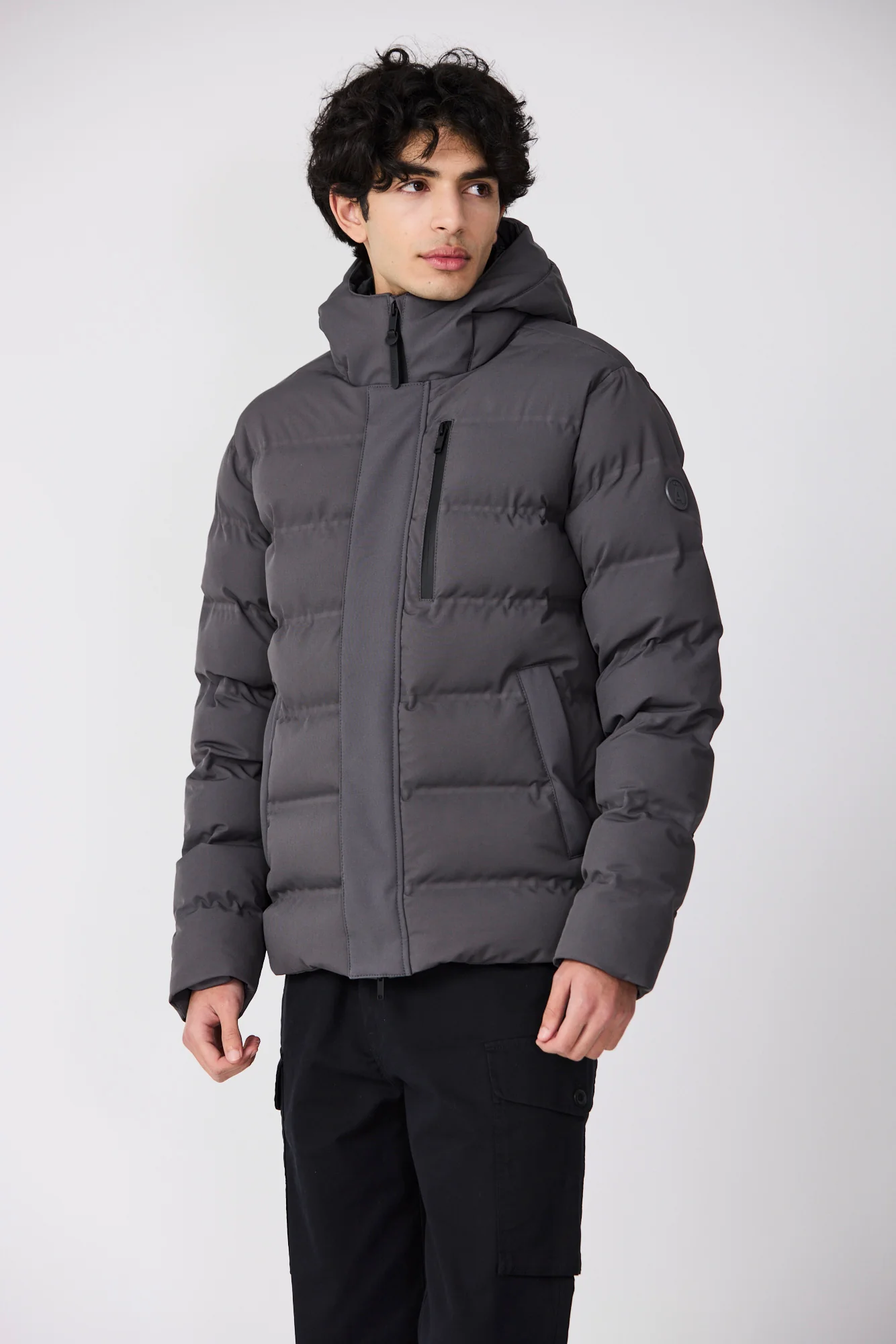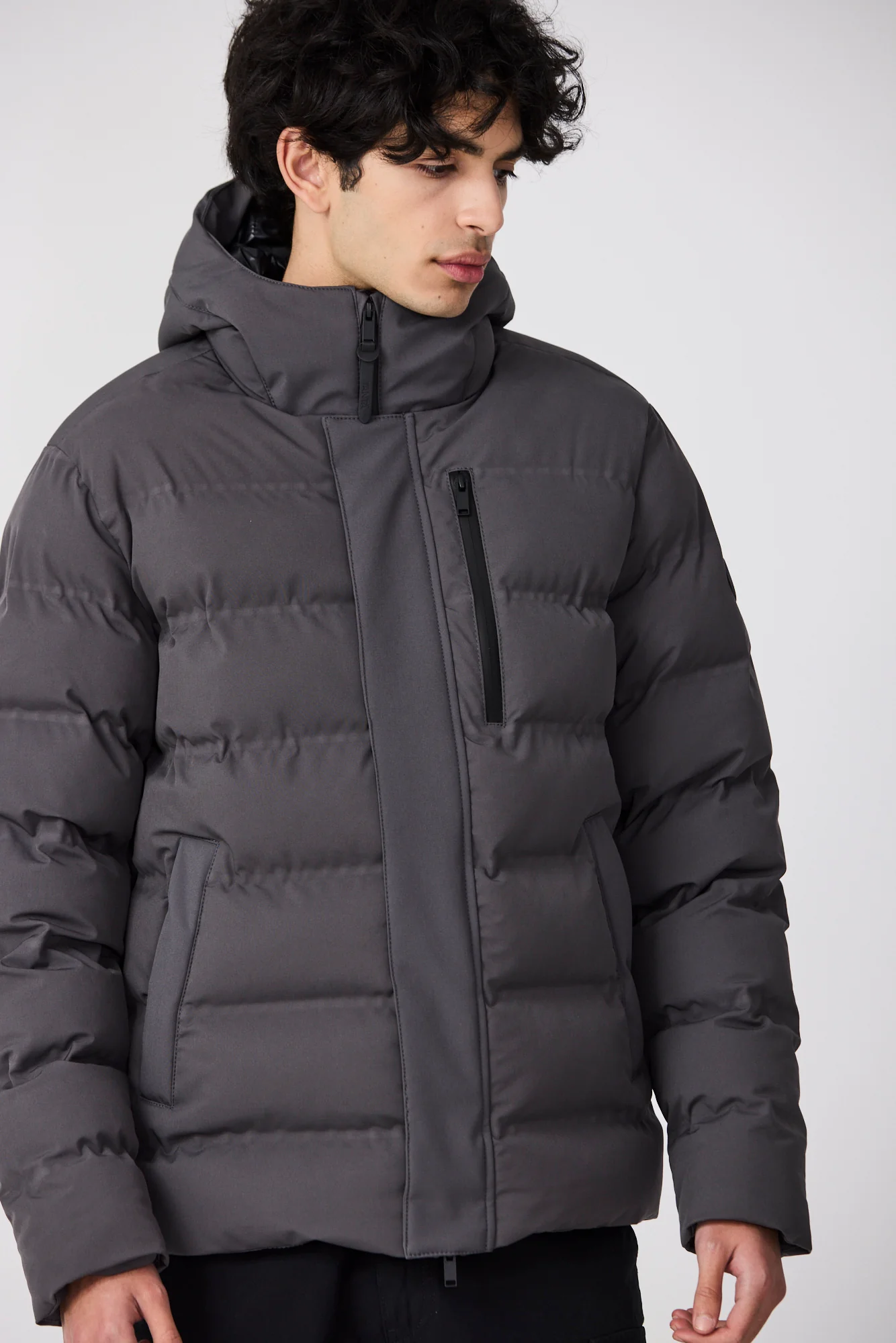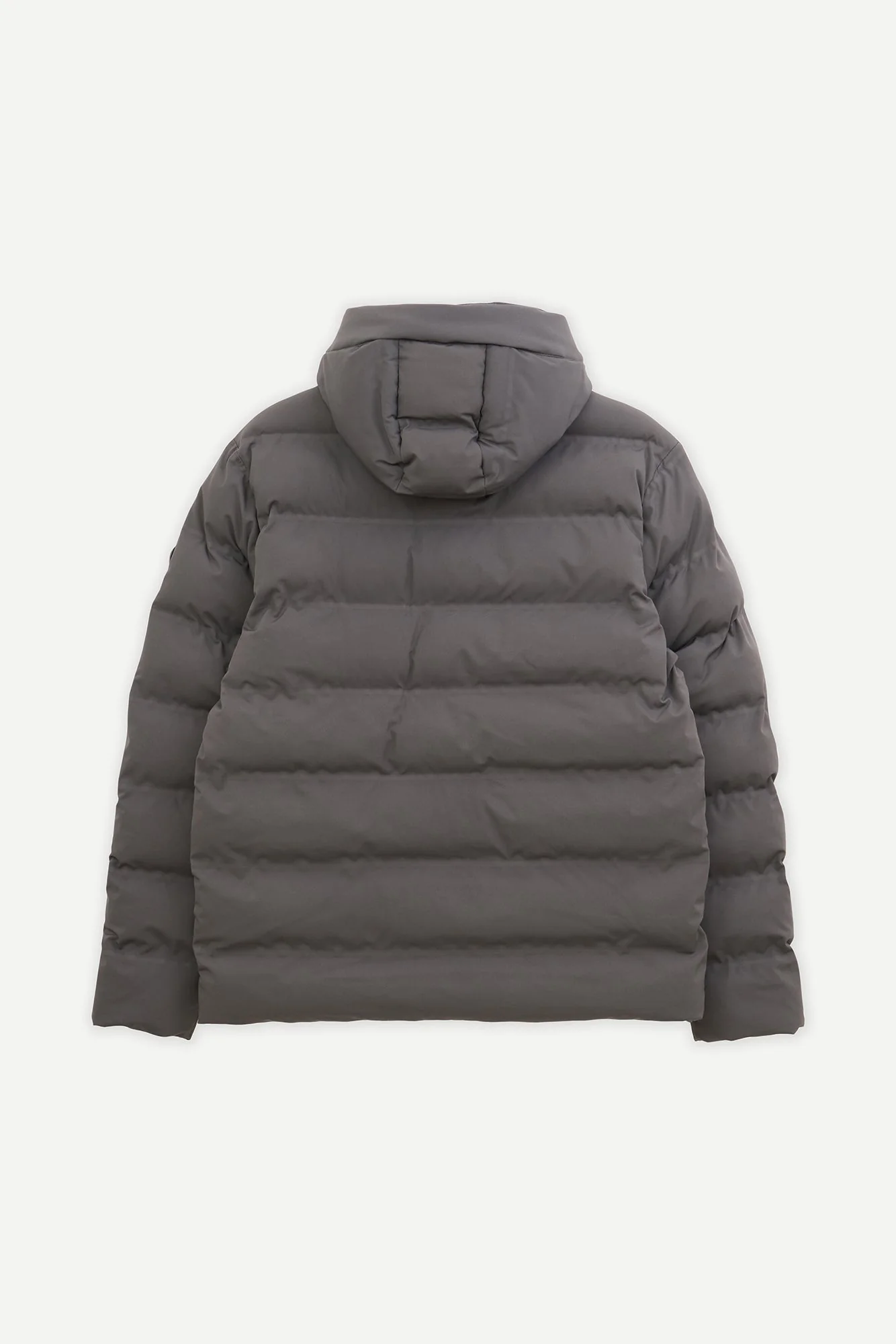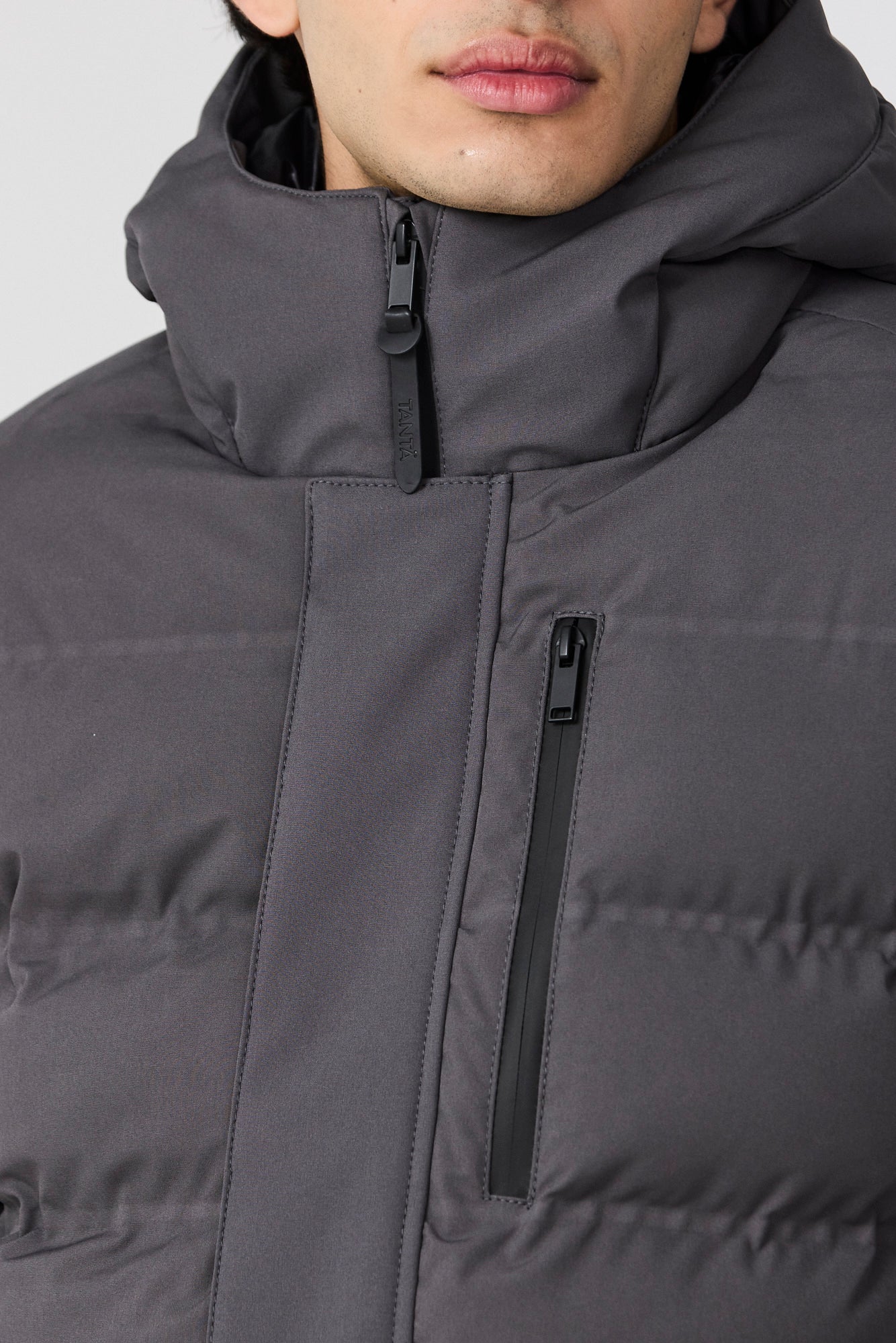Los detalles de diseño incluyen un bolsillo en el pecho con cremallera impermeable en contraste negro, una cremallera frontal impermeable de doble cursor oculta y una solapa con cierre magnético. Una interpretación fresca, juvenil y sofisticada del sportswear urbano contemporáneo.