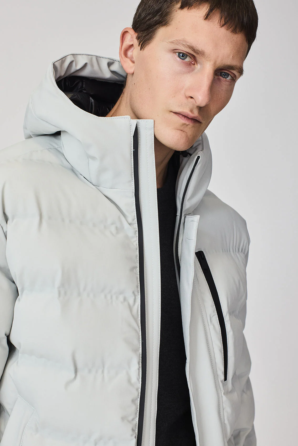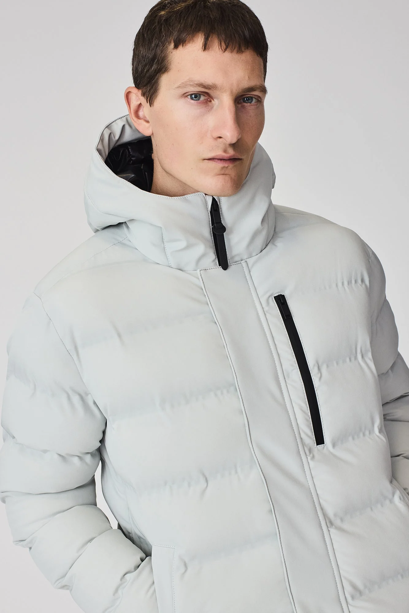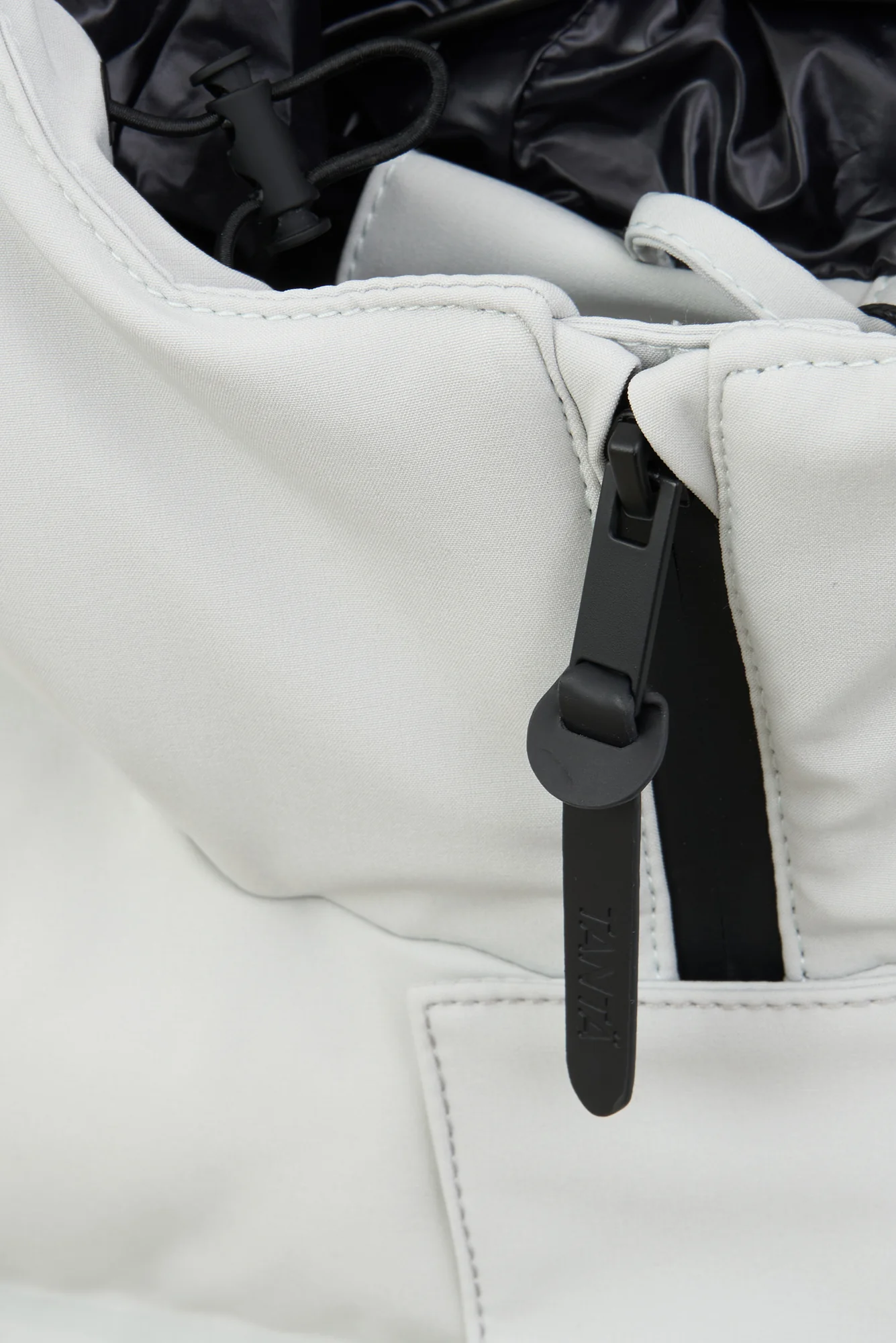 Los detalles de diseño incluyen un bolsillo en el pecho con cremallera impermeable en contraste negro, una cremallera frontal impermeable de doble cursor oculta y una solapa con cierre magnético. Una interpretación fresca, juvenil y sofisticada del sportswear urbano contemporáneo.