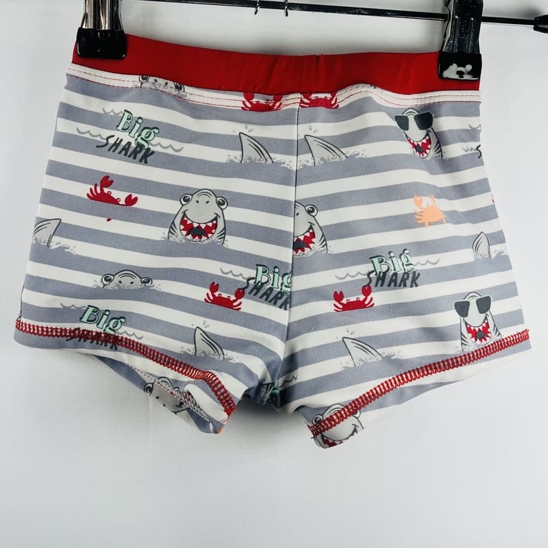 Maillot de bain short garçon 3/4 ans à motifs requins, sans marque. Confortable et stylé avec ses bandes blanches et grises. Parfait pour l’été à petit prix !