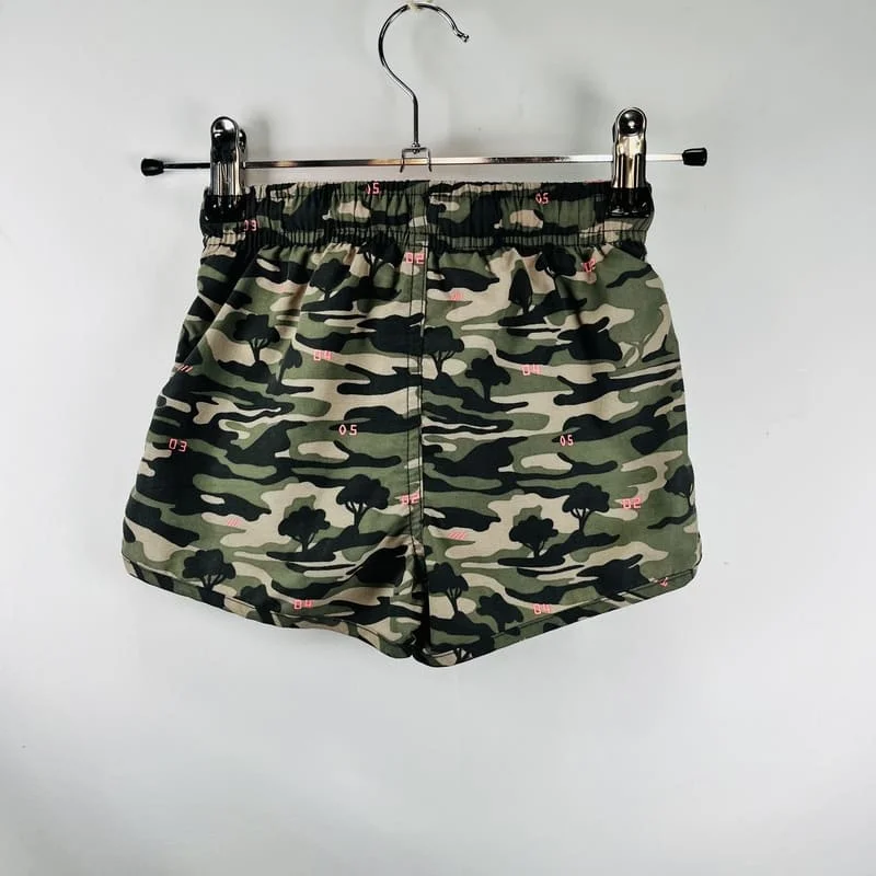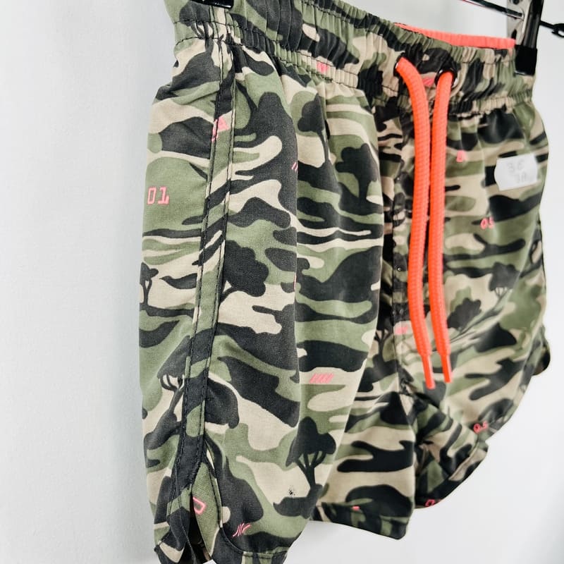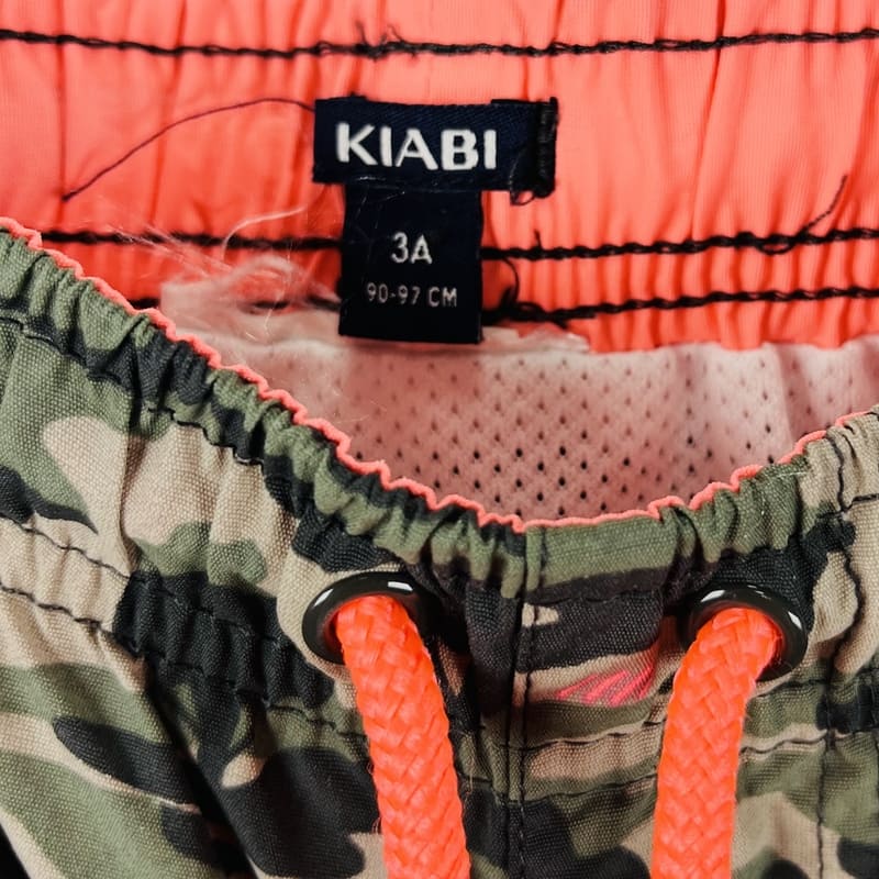 Maillot de bain garçon (short) Kiabi, taille 3 ans, motif militaire kaki. Confortable et pratique pour l’été. Petit prix pour un grand plongeon !