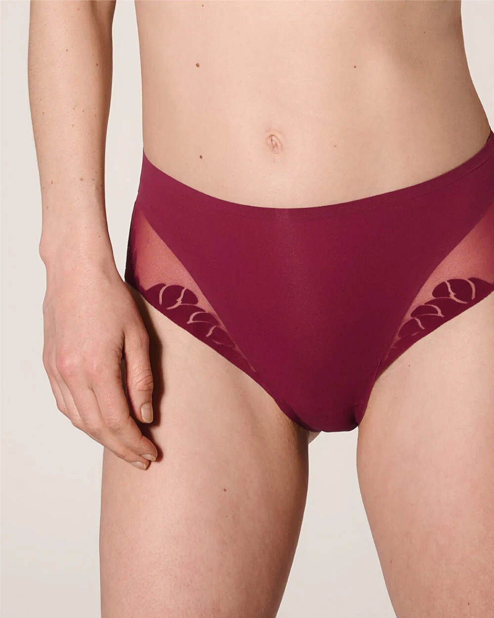 ∙Une culotte technique de sport qui n’oublie pas d’être élégante avec ses jeux de transparence en tulle stretch et ses motifs floraux velvet touch.