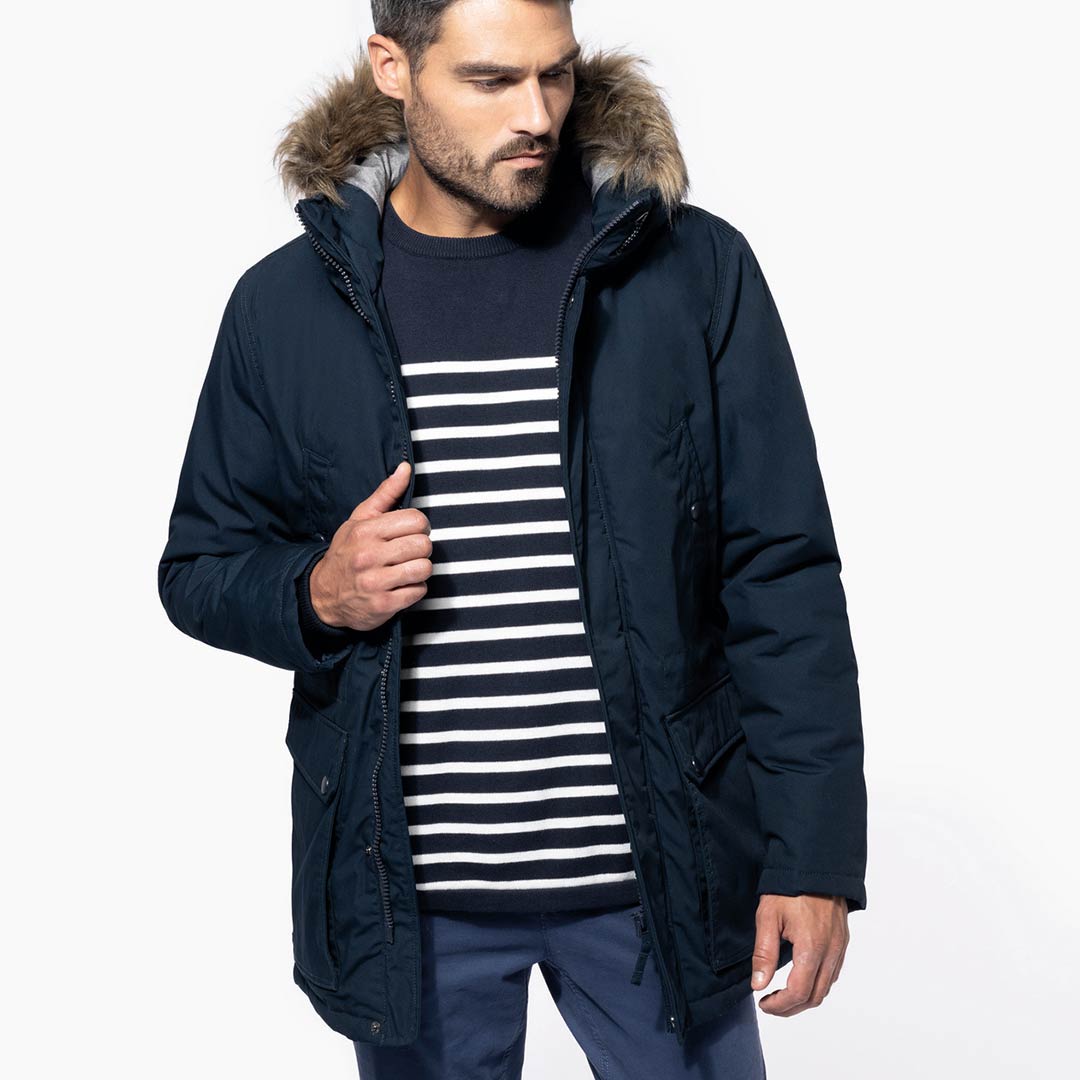 Toile épaisse en 65% polyester / 35% coton. Enduction PU. Doublure matelassée 100% polyester. Fermeture zippée cachée par patte et boutons pression. Capuche doublée et matelassée avec fausse fourrure détachable. 4 poches extérieures avant : 2 grandes poches double ouverture avec rabat pressionné et 2 poches poitrine passepoilées avec bouton pression. 1 poche intérieure avec fermeture par bande auto-agrippante. Taille ajustable par cordon de serrage intérieur. Poignets intérieurs en bord-côte. 1 zip côté cœur et 1 zip au bas du vêtement pour accès personnalisation.