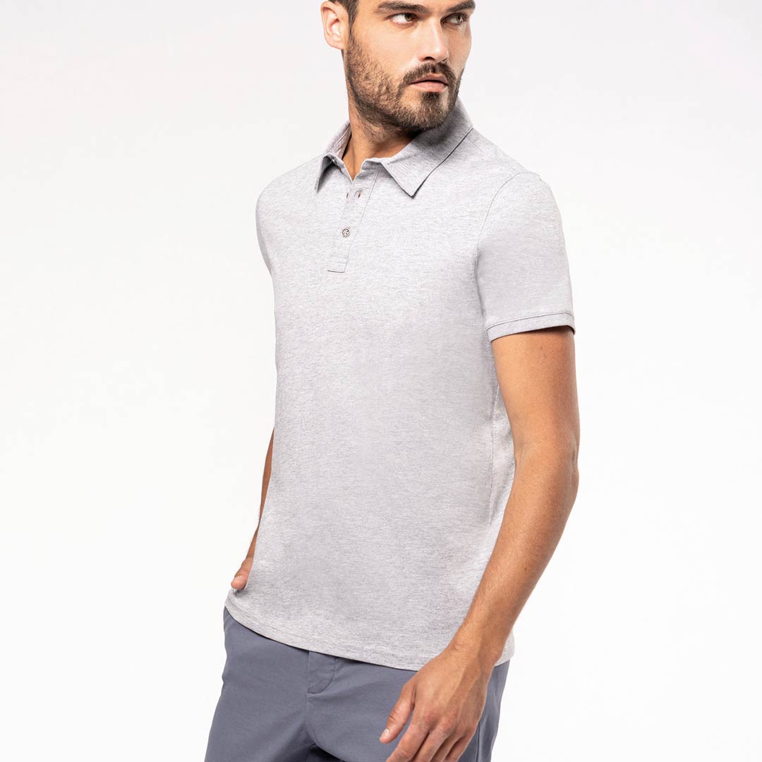 100% coton peigné (French Navy Heather : 80% coton / 20% polyester – Grey Heather : 65% polyester / 35% coton – Oxford Grey : 90% coton / 10% viscose). Maille jersey. Col chemise. Patte de boutonnage col 3 boutons métal. Empiècement épaule. Finition bord-côte au bas de manches. Double aiguille bas de vêtement. Certifié STANDARD 100 by OEKO-TEX®N° CQ1007/7, IFTH.