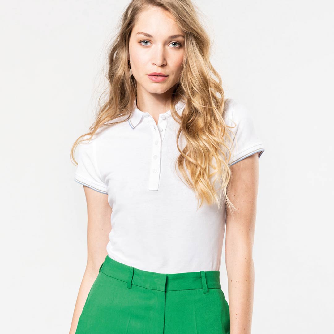 100% coton piqué. Patte de boutonnage col 5 boutons. Bande de propreté contrastée encolure et fentes côtés. Finitions bord-côte avec liserés contrastés col et bas de manches. Double aiguille bas de vêtement. Certifié STANDARD 100 by OEKO-TEX® N° CQ 1007/7, IFTH.