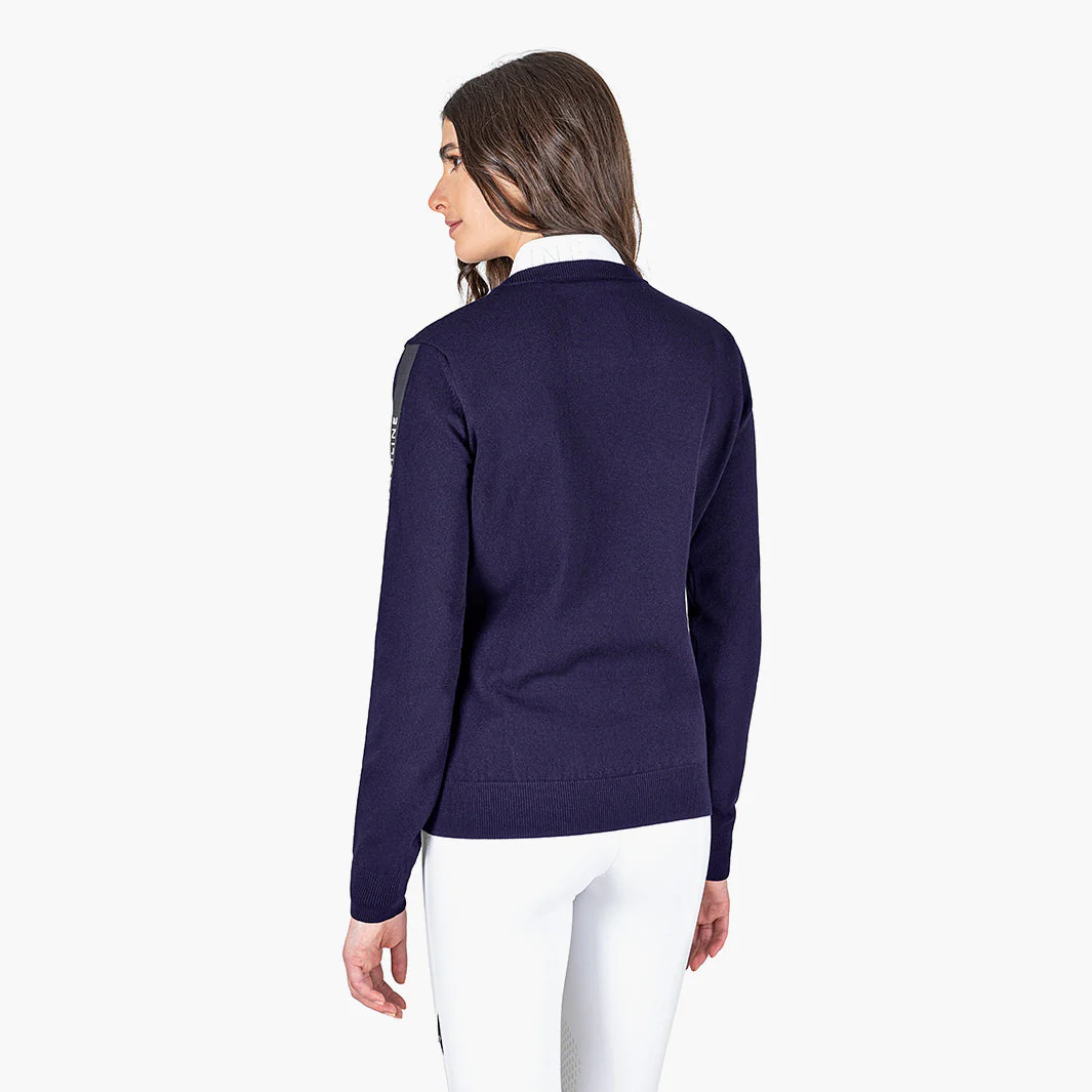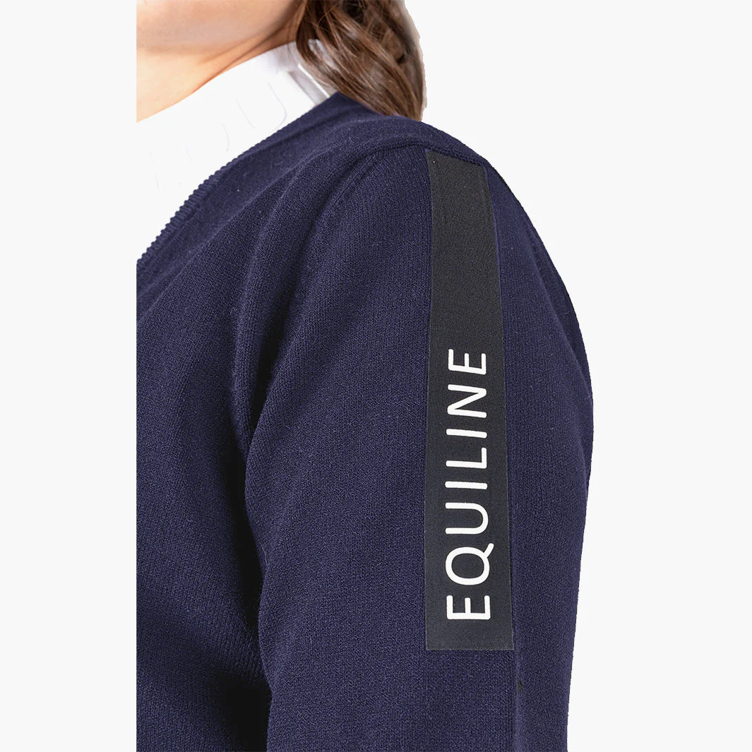 Pourquoi choisir CINOC plutôt qu’un autre pull? Son tissu technique, son col en V flatteur et les finitions bord-côte procurent une allure soignée tout en restant très pratique au quotidien. L’écusson Equiline sur l’épaule gauche est un petit détail signature qui affirme une identité sportive et premium.